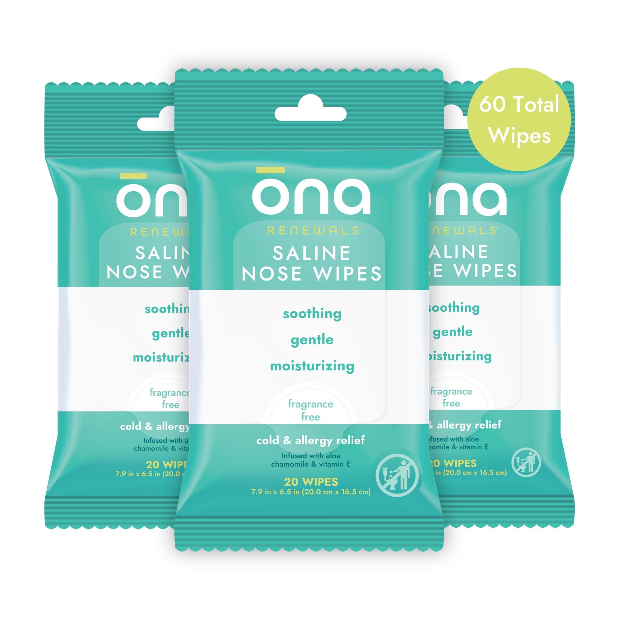 Ona Renewals Saline Nose Wet Wipes, Hydrates and Soothes, Made with Natural Saline with Aloe, Vitamin E, Chamomile, Hypoallergenic, Fragrance Free 20 Ct (Pack of 3)
