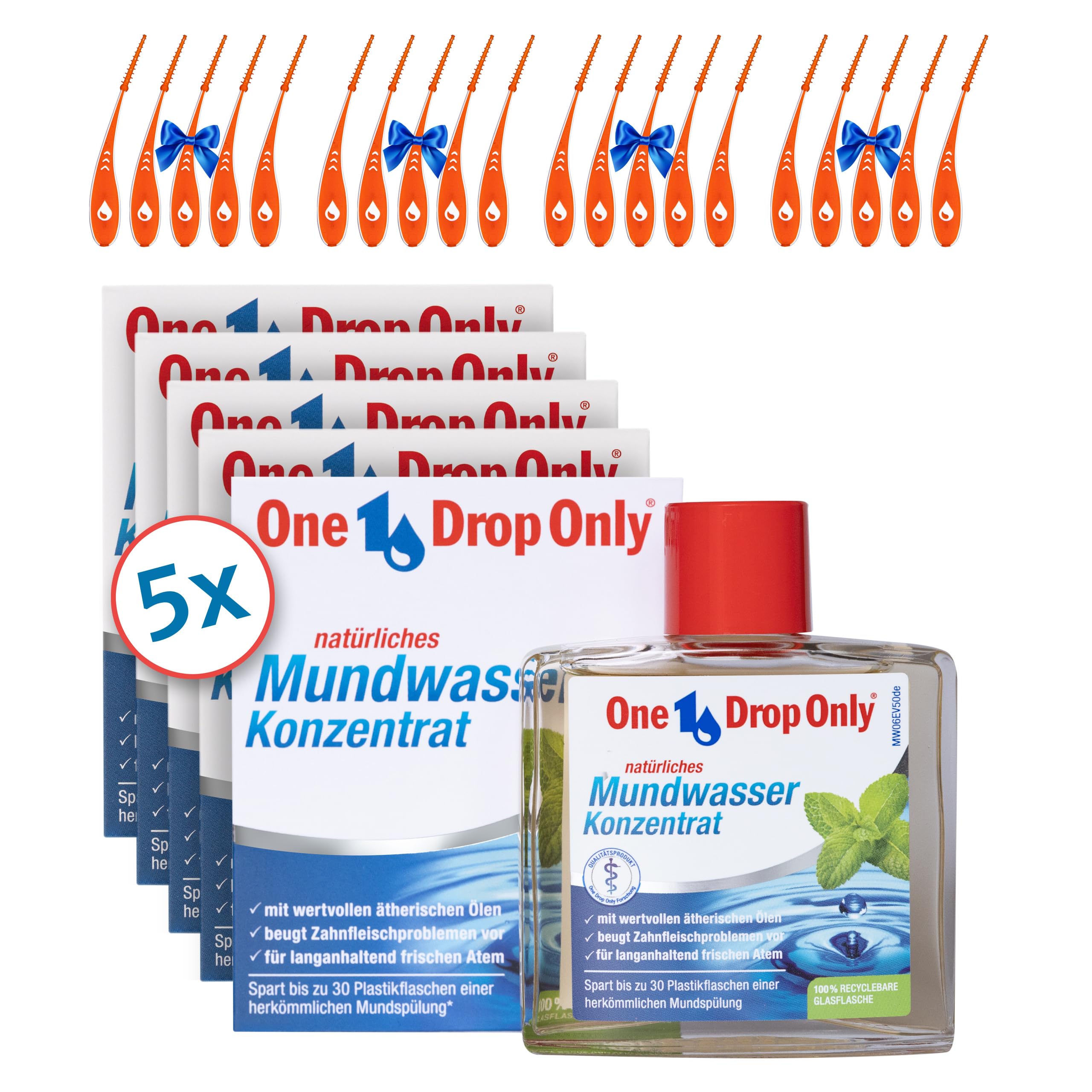 Made in Germany: The One Drop Only mouthwash against bad breath is produced in Germany and meets the highest quality criteria, thus providing an ideal building block for good oral care. Natural freshness: The mouthwash with essential oils includes herbal ingredients such as peppermint, cloves, sage, thyme and tea tree oil, as well as bento tincture. Economical and sustainable: just one drop of mouthwash is diluted with 15 ml of water, so that 50 ml of concentrate is sufficient for up to 1,000 applications. Nearly 30 bottles of ready-to-use mouthwash are thus saved, i.e. more than 1.2 kg of plastic less waste. The packaging is FSC certified. All-round protection: the mint mouthwash without fluoride provides long-lasting fresh breath, can protect against bleeding gums and painful gum infections and at the same time contributes to strengthening and strengthening the gums. Proven quality: For more than 70 years, the One Drop Only antibacterial mouthwash concentrate has provided fresh breath, clean teeth and well-groomed gums. Whether in the morning, in the evening or as a quick fresh kick in between.One Drop Only - 5 stuks per 50 ml mondwaterconcentraat 20 tandprikkers gratis, zuinig mondwater voor dagelijks gebruik, voor maximaal 1000 toepassingen bij 1 druppel slechte adem bestrijdenMade in Germany: het One Drop Only mondwater tegen slechte adem wordt in Duitsland geproduceerd en voldoet aan de hoogste kwaliteitscriteria en biedt zo een ideale bouwsteen voor een goede mondverzorging. Natuurlijke frisheid: het mondwater met etherische oliën bestaat onder andere uit plantaardige ingrediënten zoals pepermunt, kruidnagel, salie, tijm en theeboomolie, evenals bentinctuur. Zuinig en duurzaam: slechts één druppel mondwater wordt met 15 ml water verdund, zodat 50 ml concentraat voldoende is voor maximaal 1.000 toepassingen. Bijna 30 flessen gebruiksklare mondspoeling worden zo bespaard, d.w.z. meer dan 1,2 kg plastic minder afval. De verpakking is FSC-gecertificeerd. Rondom beschermd: het muntmondwater zonder fluoride zorgt voor langdurig frisse adem, kan beschermen tegen bloedend tandvlees en pijnlijke tandvleesontstekingen en draagt tegelijkertijd bij aan de versterking en versteviging van het tandvlees. Bewezen kwaliteit: al meer dan 70 jaar zorgt het One Drop Only antibacteriële mondwaterconcentraat voor een frisse adem, schone tanden en verzorgd tandvlees. Of het nu 's morgens, 's avonds of als snelle frisse kick voor tussendoor is.