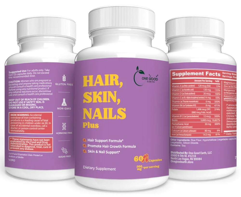 One Good Earth Hair Skin & Nails Plus (60 Capsules) 500mg+ with Biotin Vitamins & Minerals Saw Palmetto with Vitamins A C D and E