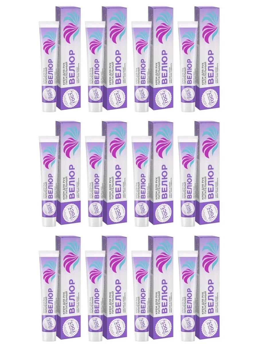 КК ВЕЛЮР Крем для рук 70мл. Комплект из 12 штук.Издавна люди следуют традициям, бережно и с любовью передавая знания и накопленную мудрость. Для себя и своих близких мы выбираем самое лучшее, то, что прошло проверку временем. Серия Сделано по ГОСТу Сто Рецептов Красоты разработанна с учетом традиций и современных стандартов качества. Тонкий приятный аромат крема для рук Велюр Сто рецептов красоты пленит вас с первых секунд. Он надежно защищает, питает и увлажняет кожу, сохраняя ее молодость и красоту. Ежедневное использования крема улучшит защитную функцию кожи. Важно помнить, что кожа рук требует такого же внимания и заботы, как и кожа лица. В современном мегаполисе нехватка кислорода и питательных веществ частый случай - не забывайте восполнять природный уровень для вашей кожи. С кремом Велюр Сто Рецептов Красоты с вами всегда будет первый помощник при сухости кожи рук.