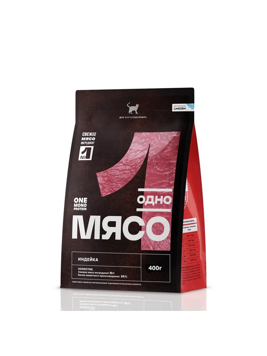 Одно Мясо, Сухой полнорационный корм для взрослых кошек с мясом индейки, 400г. Свежее мясо – это естественная и полезная пища для хищных животных, поскольку их пищеварительная система эволюционно приспособлена к перевариванию и усвоению такой пищи. Наши домашние питомцы – тоже хищники, и свежее мясо – лучший рацион, который предусмотрела для них природа. Заботливый хозяин с уважением и вниманием относится к потребностям домашних любимцев и делает все возможное, чтобы обеспечить его самым лучшим и полезным питанием. Одно мясо – выбор ответственных владельцев домашних питомцев!