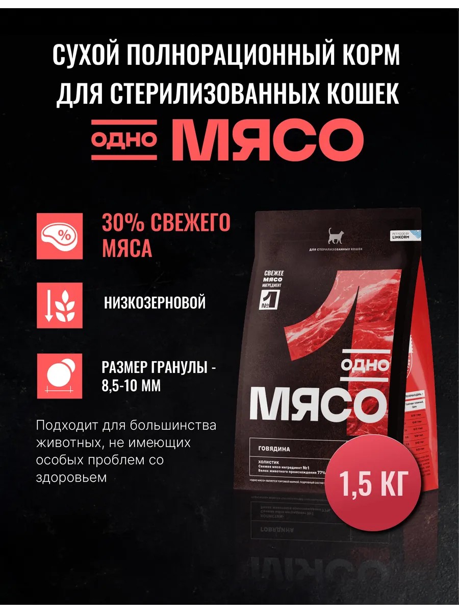 Одно Мясо Сухой корм для стерилизованных кошек говядина 1,5 кг