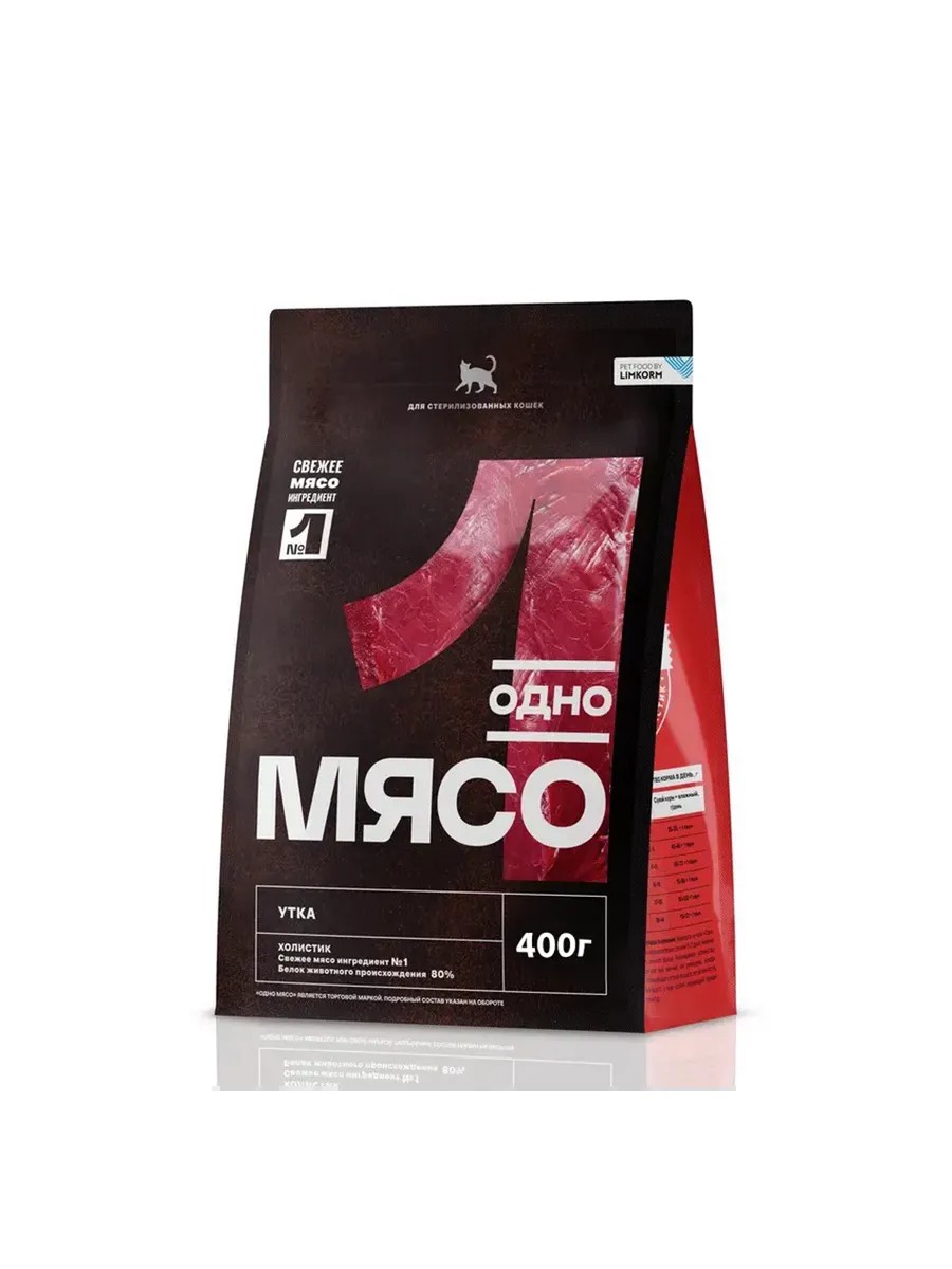 Одно Мясо. Сухой корм для стерилизованных кошек с уткой, 400г. Свежее мясо – это естественная и полезная пища для хищных животных, поскольку их пищеварительная система эволюционно приспособлена к перевариванию и усвоению такой пищи. Наши домашние питомцы – тоже хищники, и свежее мясо – лучший рацион, который предусмотрела для них природа. Заботливый хозяин с уважением и вниманием относится к потребностям домашних любимцев и делает все возможное, чтобы обеспечить его самым лучшим и полезным питанием. Одно мясо – выбор ответственных владельцев домашних питомцев!