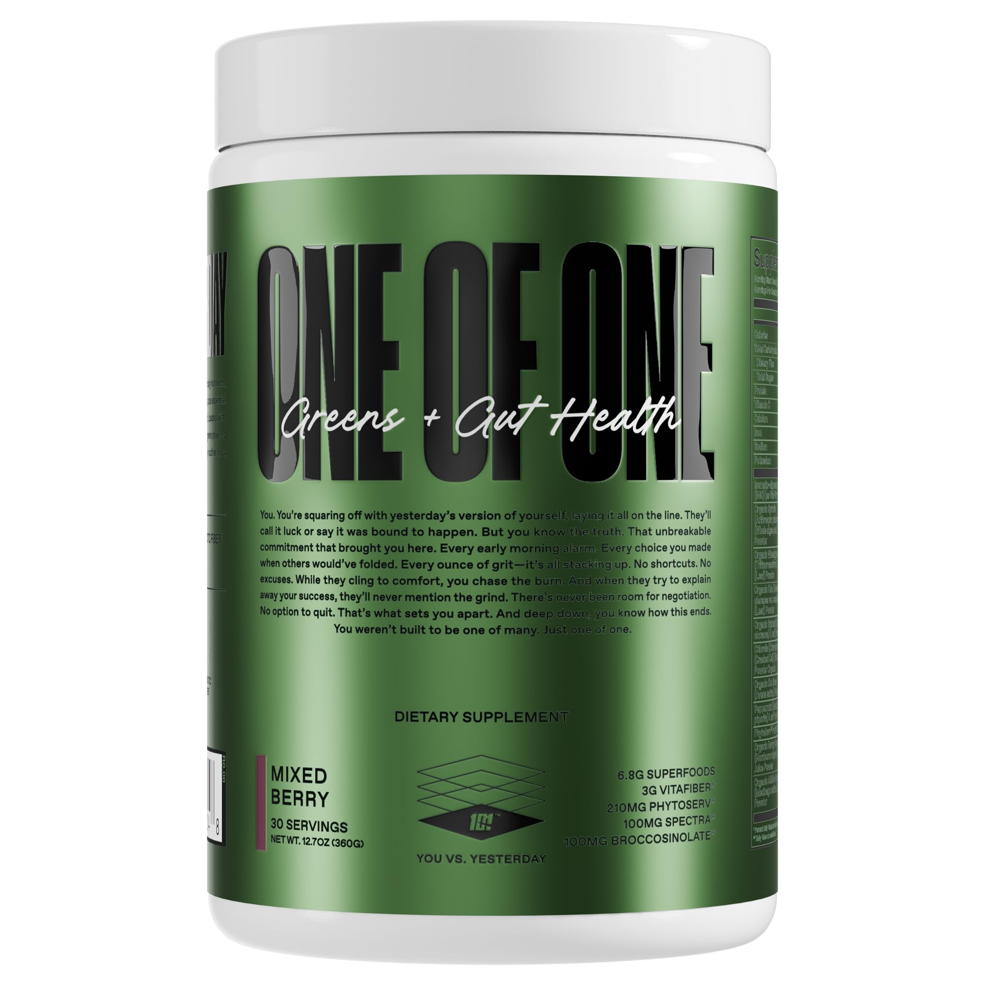 Made in the USA and manufactured in cGMP facilities to ensure purity, potency, and safety. Built by champions. Backed by science. Trusted by athletes. Co-founded by boxing legend, Floyd Mayweather Jr., ONE OF ONE (101) is dedicated to empowering individuals to achieve peak performance for every sport at every level with high-quality, scientifically formulated supplements developed to fuel their fitness journeys. Promotes Overall Well-Being: Supercharges your daily nutrient intake, delivering green-powered goodness in every scoop. Supports Gut Health: Loaded with prebiotic fiber, this formulation is the foundation for a healthy gut. Packed with 6.8G SUPERFOODS: this powerhouse has 4 servings of fruit and veg plus essential vitamins and antioxidants to enhance your daily wellness routine and keep you at your best.
