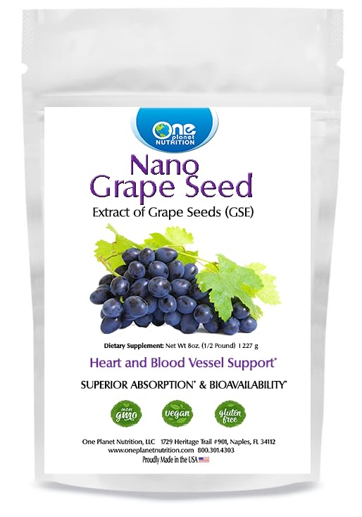 One Planet Nutrition Nano Grape Seed Extract Powder 8 oz (227 Servings) delivers a highly concentrated and long-lasting bulk powder form of Vitis vinifera (grape seed) extract, known for its exceptionally high levels of oligomeric proanthocyanidins (OPCs)—powerful polyphenols that may support antioxidant activity, vascular health, detoxification, and skin health. Using our patented nano-particle sizing process, we reduce each particle to between 1–100 nanometers for superior absorption and maximum biological activity at the cellular level. Experience the deep antioxidant potential of Nano Grape Seed Extract—refined for maximum impact and long-term cellular support.About One Planet Nutrition One Planet Nutrition is a trusted manufacturer and distributor of high-quality, natural, and nano-sized health supplements. Using a proprietary patented process, we shrink raw materials to less than 100 nanometers to improve cellular absorption and bioavailability. Our products are manufactured in an FDA-registered, cGMP-compliant facility, and every batch undergoes rigorous third-party testing to ensure purity, potency, and effectiveness. We are committed to providing the most advanced health solutions to support your wellness journey. Dosing Usage Each 8 oz bag provides approximately 227 servings at 1 gram per serving or 454 servings at 0.5 grams per serving. This long-lasting bulk powder is ideal for smoothies, shakes, or capsule filling. Suggested use: Mix 0.5–1 gram daily into water, juice, or a beverage of choice, or as directed by your healthcare provider. Premium Quality You Can Trust 100 Nano Grape Seed Extract (Vitis vinifera) Standardized for high-potency OPC content Nano-particle sized for enhanced bioavailability Vegan, Gluten-Free, Non-GMO, and Soy-Free No fillers, additives, or preservatives Third-party tested for purity, heavy metals, and microbial content Manufactured in a U.S. FDA-registered, cGMP-compliant facility. Comprehensive Health Benefits Rich in oligomeric proanthocyanidins (OPCs) that may support antioxidant activity and detoxification by neutralizing free radicals May promote cardiovascular and circulatory health by supporting capillary strength and endothelial function May help maintain skin elasticity and collagen stability through antioxidant mechanisms May support brain and eye health by enhancing blood flow and reducing oxidative stress Traditionally used to promote longevity, vitality, and recovery. Nano Technology for Superior Absorption Our proprietary process reduces Grape Seed Extract particles to under 100 nanometers—well below the body's approximate 200 nm absorption threshold—enabling rapid and efficient cellular uptake. This allows the active OPC compounds to be absorbed more thoroughly, offering deeper support for oxidative balance and microvascular integrity.
