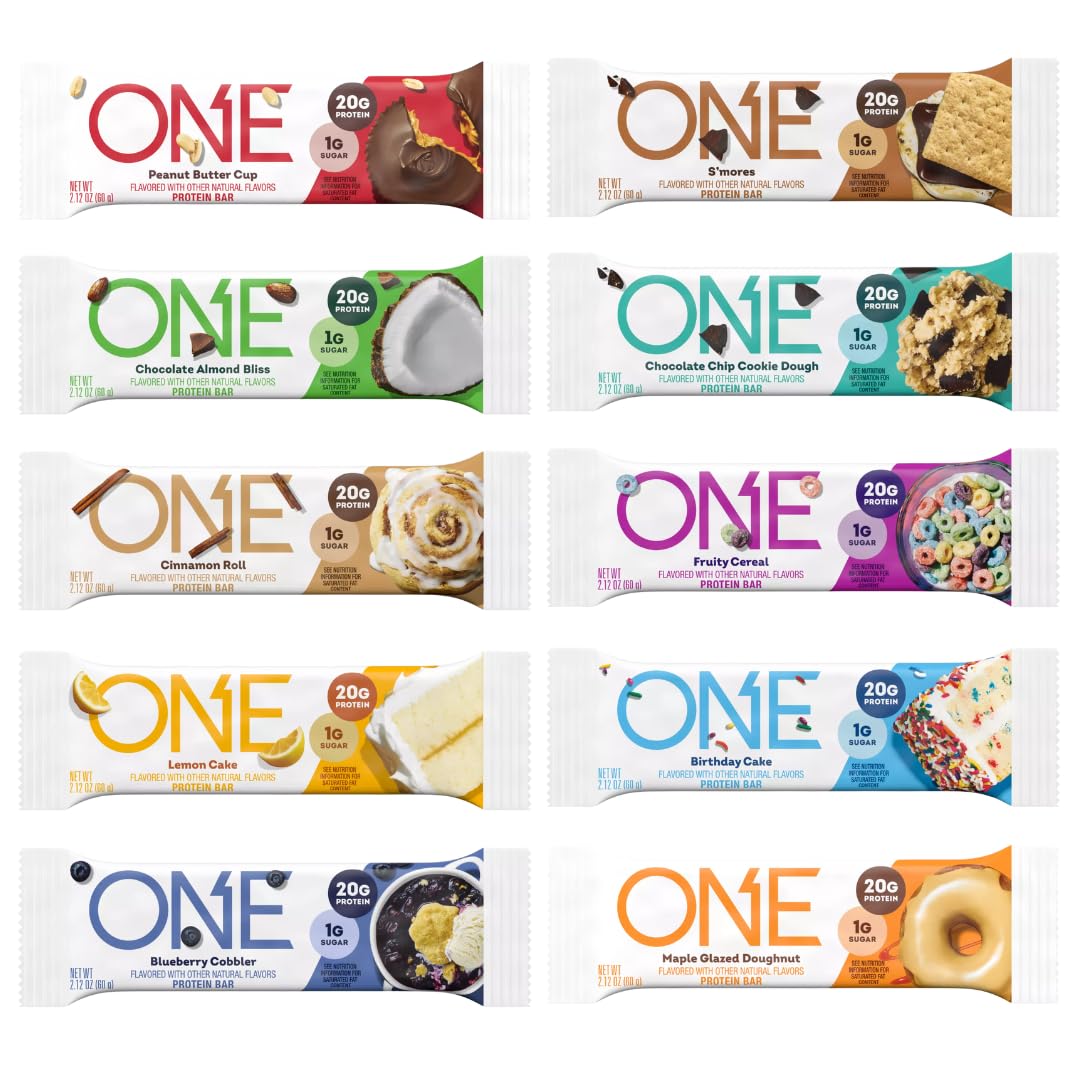Finally, a Protein Bar That Tastes Like a Treat. Why choose between nutrition and flavor? ONE Protein Bars are designed for those who want the best of both worlds. Each bar provides a powerful 20g of protein to support your active lifestyle, yet contains just 1g of sugar. Why This Variety Pack is the Perfect Choice: Excellent Macros: With roughly 210–220 calories and high fiber content, these bars provide sustained energy without the sugar crash common in traditional snacks. Superior Texture: Say goodbye to dry, chalky protein supplements. ONE bars are famous for their soft, doughy core and smooth outer coating that mimics the experience of a candy bar. Versatile Fueling: Whether you are an athlete, a busy professional, or just looking for a better-for-you snack, these bars fit seamlessly into your daily routine. What's Inside the Box? This 10-count variety pack takes the guesswork out of choosing. We've bundled our most popular, dessert-inspired flavors so you can find your favorite while keeping your protein routine fresh and exciting.