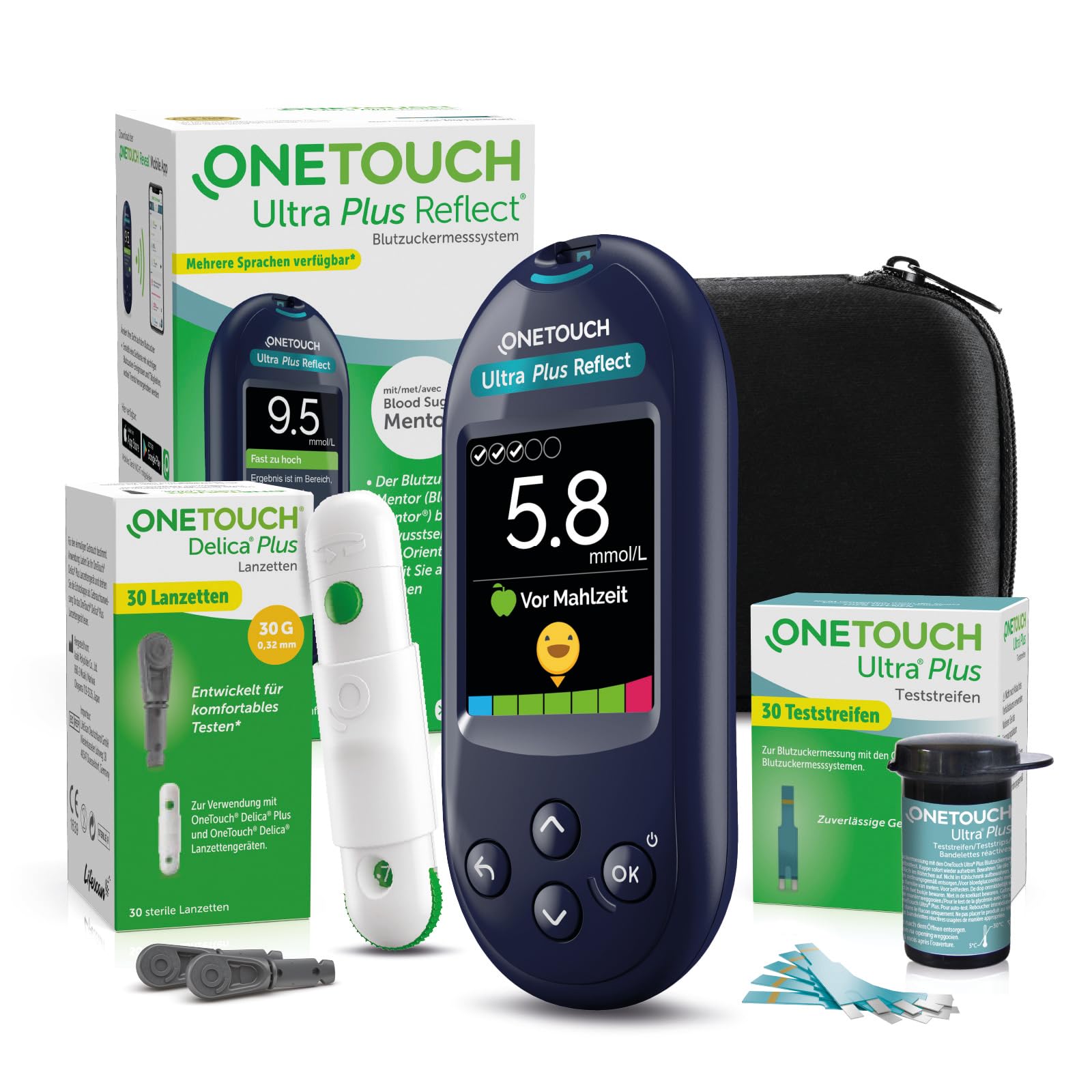 Your blood glucose control system for easy testing and fast glucose results. Get accurate blood glucose test results with the OneTouch Blood Glucose Monitoring System. This blood glucose meter kit with strips contains everything you need for daily blood glucose testing, including OneTouch Delica Plus lancets, OneTouch Delica Plus lancing device, and a case to color-code your blood glucose levels on the go or at home. All in one case - ideal for on the go. The starter kit gives you an additional 40 test strips 40 lancets to be well equipped for diabetes management. The OneTouch Blood Glucose Meter gives you an accurate test result in just 5 seconds. The meter's dynamic three-color range display alerts you to high and low values with color-coding so you can act quickly. The meter's built-in Blood Sugar Mentor feature gives you tips based on your glucose results. The meter lets you know when you're approaching a high or low reading, and when connected to the OneTouch Reveal app, the app provides in-depth recommendations and understanding to avoid high and low readings in the future. The OneTouch Ultra Plus Reflect meter reviews past results and uses the Blood Sugar Mentor feature to display alerts that automatically identify times when you're likely to experience highs and lows, so you can make changes to your daily routine. The OneTouch Delica Plus lancets and OneTouch Delica Plus lancing device are designed to let you choose the depth settings when performing a blood glucose test. The lancing device offers a more precise and gentle lancing experience with the precise guidance technology. The silicone-coated OneTouch Delica Plus blood lancets with an extra-fine tip glide smoothly into the skin for a more comfortable testing experience. The meter offers easy and convenient blood glucose testing. Each test strip requires only a very small sample size of 0.4 µL of blood and provides a value in as little as 5 seconds. The Trend 90 Day feature lets you set your 90-day average blood glucose goal and track progress toward that goal. The OneTouch Reveal app also helps you simplify data sharing between you and your healthcare professional. The OneTouch Reveal app also applies ColourSure technology and automatically organizes your blood glucose results in a color-coded logbook in one view that is linked to your logged foods, insulin and activities. For more than 40 years, LifeScan has been advancing blood glucose management and diabetes care with breakthrough technologies and new products that deliver simplicity, accuracy and confidence. Our goal is to create a world without limits for people with diabetes. Today, LifeScan is the global leader in blood glucose monitoring - more than 20 million people worldwide rely on our trusted OneTouch brand products to improve their diabetes management. What's included: a. Virtually painless testing of your blood glucose with the OneTouch Delica Plus lancing device b. Fast and accurate test results of your blood glucose level c. Dynamic three-color range display with emoji d. Blood Sugar Mentor feature for personal recommendations (tips), understanding (pattern recognition) and motivation (motivational messages) e. The meter has a daily test tracking feature that allows you to set the planned number of tests per day and track progress towards that goal. f. Storage of up to 750 test results Scope of delivery: 1x OneTouch Ultra Plus Reflect, 40x OneTouch Ultra Plus test strips, 40x OneTouch Delica Plus lancets, 1x OneTouch Delica Plus lancing device, case, manual. ALMOST PAINLESS: We can't do the finger pricking for you - but we try to make it as painless as possible. Customize the testing process to your preferences by selecting one of 13 depth settings. UNDERSTANDING AND MOTIVATION: The meter offers personalized recommendations, creates understanding and strengthens motivation. The free OneTouch Reveal app offers even more in-depth information & tips when connected to the meter. TURNS NUMBERS INTO COLORS: The ColorSure Range Indicator helps you understand your blood glucose levels using the colors green (borderline), blue (below borderline) or red (above borderline) - and even smiles at you with an emoji. 11 YEARS OF PROVEN ACCURACY: The OneTouch Ultra Plus Reflect meter combined with OneTouch Ultra Plus test strips delivers accurate blood glucose results in just 5 seconds. EASY TO USE: Simply insert a new test strip, apply a small drop of blood and read your glucose result - in just 5 seconds! The device then turns your value into colors for easier understanding. COMPLETE DIABETES TEST KIT. QUALITY THAT PAYS OFF: Includes 1 OneTouch Ultra Plus Reflect blood glucose meter, 40 OneTouch Ultra Plus test strips, 40 OneTouch Delica Plus lancets, 1 Delica Plus lancing device and case - everything you need for blood glucose monitoring and measurement. Ihr Blutzucker-Kontrollsystem für einfache Tests und schnelle Glukose-Ergebnisse. Erhalten Sie genaue Blutzucker-Testergebnisse mit dem OneTouch Blutzucker-Messsystem. Dieses Set für Blutzuckermessgeräte mit Streifen enthält alles, was für die tägliche Blutzucker-Messung benötigt wird, einschließlich OneTouch Delica Plus Lanzetten, OneTouch Delica Plus Stechhilfe und einem Etui, um Ihren Blutzuckerspiegel unterwegs oder zu Hause farblich einordnen zu können. Alles in einem Etui - ideal auch für unterwegs. Mit dem Startset erhalten Sie zusätzliche 40 Teststreifen 40 Lanzetten, um für die Diabetes-Behandlung gut ausgestattet zu sein. Nach nur 5 Sekunden erhalten Sie mit dem OneTouch Blutzucker-Messgerät ein genaues Testergebnis. Die dynamische dreifarbige Bereichsanzeige des Messgerätes macht Sie durch farbliche Markierung auf hohe und niedrige Werte aufmerksam, sodass Sie schnell handeln können. Die im Messgerät integrierte Funktion Blood Sugar Mentor bietet Ihnen Tipps auf der Grundlage Ihrer Glukose-Ergebnisse. Das Messgerät informiert Sie, wenn Sie sich einem hohen oder niedrigen Wert nähern, und wenn