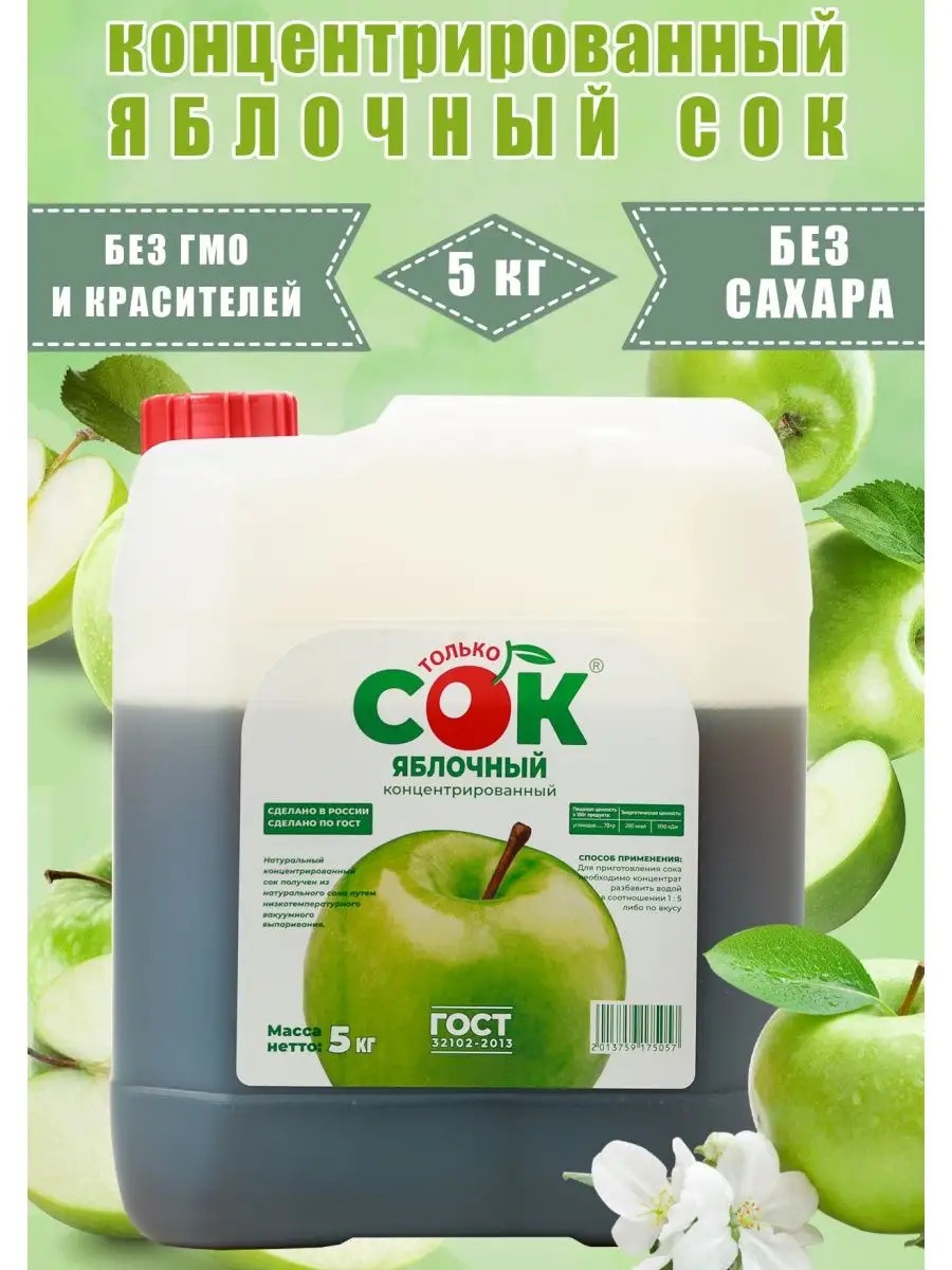 Концентрированный Яблочный сок "Только СОК" 5 кг - это натуральный продукт, произведенный из отборных плодов яблок. Благодаря качественной упаковке вкус, полезные свойства и аромат сочных фруктов сохраняются на максимальном уровне. Сок "Только СОК" произведен в России в строгом соответствии с ГОСТ.
