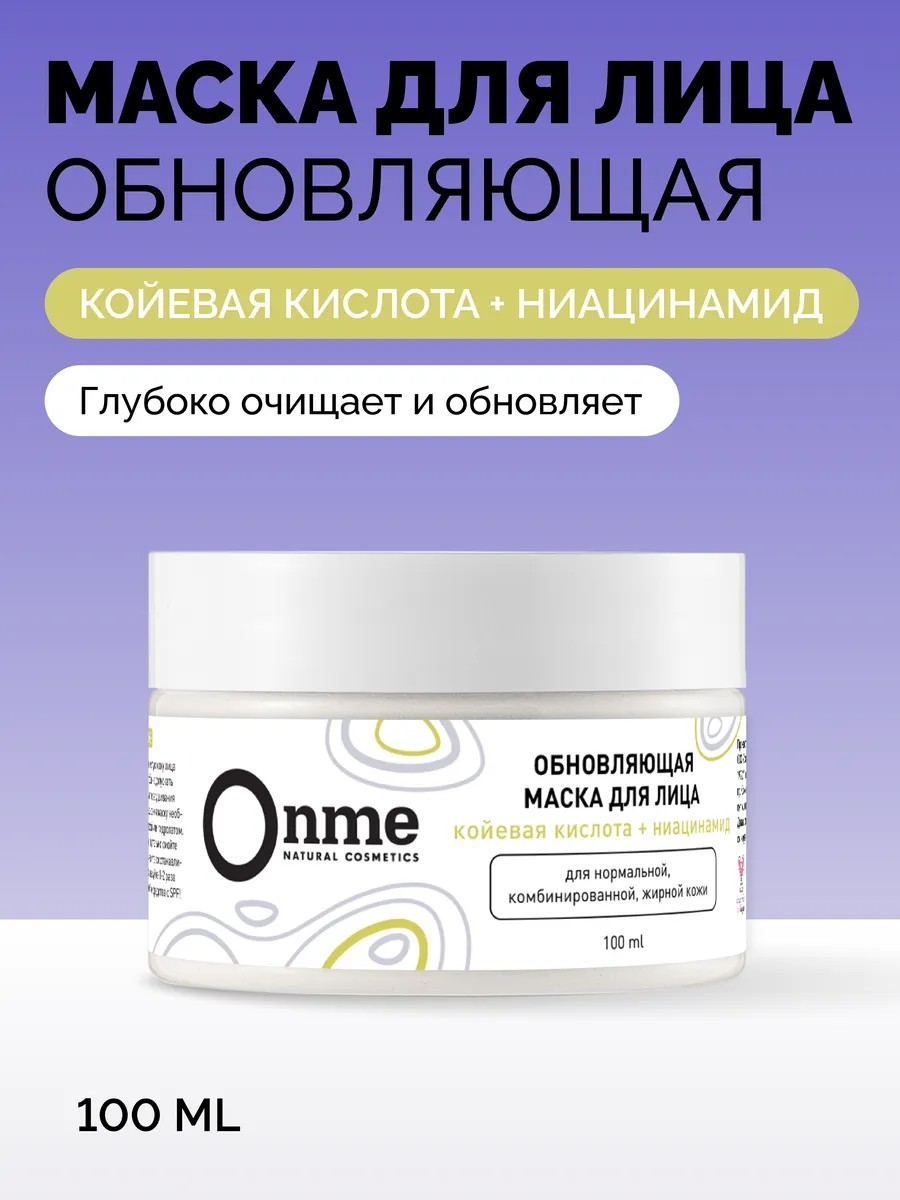 Обновляющая маска для лица Onme обеспечивает мягкое эффективное очищение, отшелушивание (пилинг эффект) и уход благодаря богатому составу на основе белой природной глины – каолина. Обладает абсорбирующими, антисептическими и бактерицидными свойствами. Стимулирует клеточное обновление, устраняет следы постакне и проявления пигментации, обеспечивает сужение пор и помогает от черных точек. Ниацинамид улучшает барьерные функции кожи, борется с воспалениями, помогает в борьбе с куперозом и является профилактикой его появления. В целях минимизации аллергических реакций не содержит в составе эфирных масел, отдушек и обладает естественным запахом содержащихся ингредиентов. Возможна индивидуальная непереносимость компонентов. При небольшом опыте использования средств с кислотами может вызывать кратковременное покраснение кожи за счет усиления кровообращения. Маска выпускается в удобном объеме 100 мл – можно брать даже в ручную кладь в самолет. Может стать хорошим подарком девушке/жене/сестре/папе/маме/коллеге/подруге/другу или подростку, так как является подходящим средством от прыщей, угрей и акне. Вы можете собрать универсальный женский или мужской подарочный набор натуральной веганской уходовой косметики на любой праздник — 23 февраля, 8 марта, день рождения, Новый год (нг), или просто подарить без повода. Также в ассортименте бренда вы можете найти средства для новорожденных детей и мальчиков и девочек подростков. Наши товары часто участвуют в акциях и распродажах, вы можете купить их со скидкой по выгодной цене. Найти средство также можно по запросам: онми, онмэ, он ми