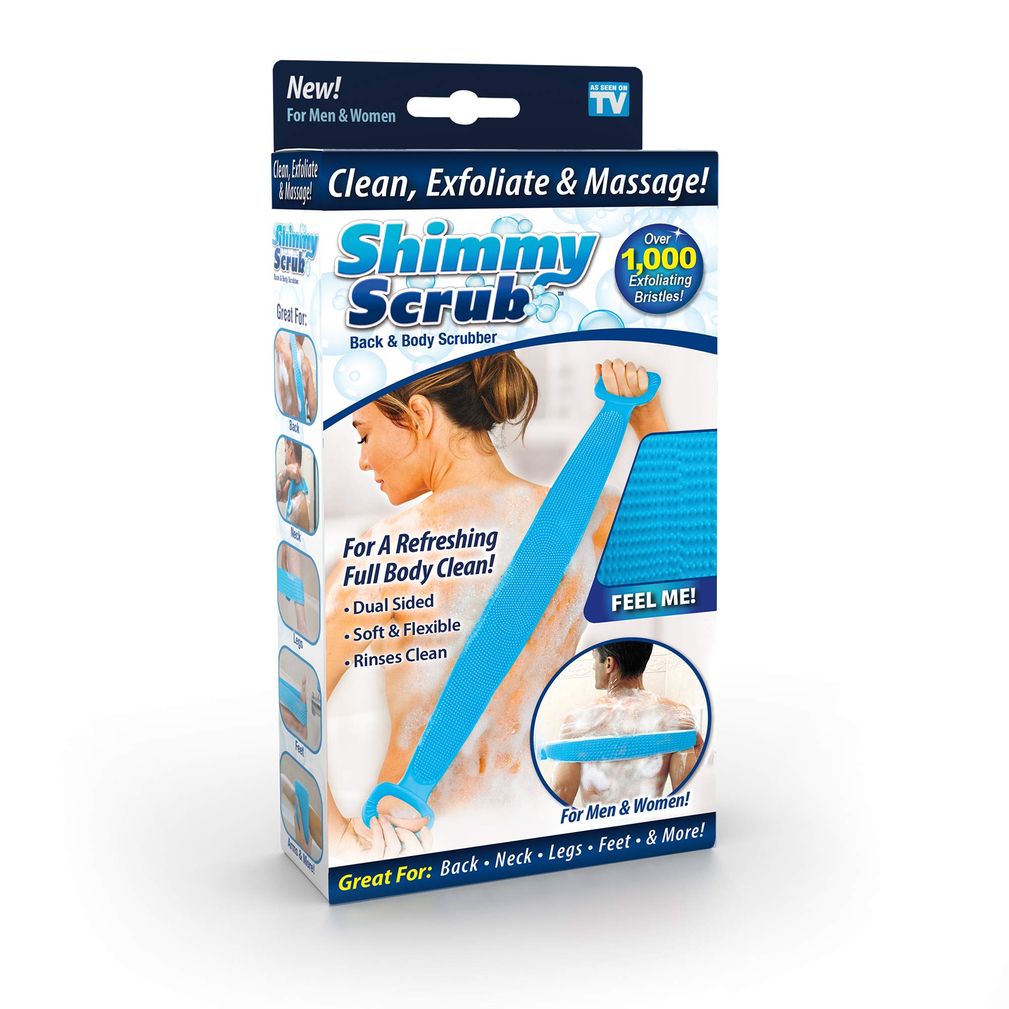 Shimmy Scrub is the soft and stretchy, dual-sided body scrubber that quickly and easily scrubs your body clean. The secret is Shimmy Scrub's hundreds of soft, micro-bristles that are specially designed to gently exfoliate skin while helping to remove dirt, oil, and dry dead skin for a smoother glow. Simply add your favorite soap or body wash onto Shimmy Scrub and scrub your entire body for a refreshing, satisfying, and deep cleansing clean Shimmy Scrub is great for getting those hard to reach areas like, the back, neck, shoulders, arms, legs, and even your feet Use the other side for an exhilarating massage. The large massage beads naturally reinvigorate skin. Use the included storage hook to hang it dry and it's ready to use for next time