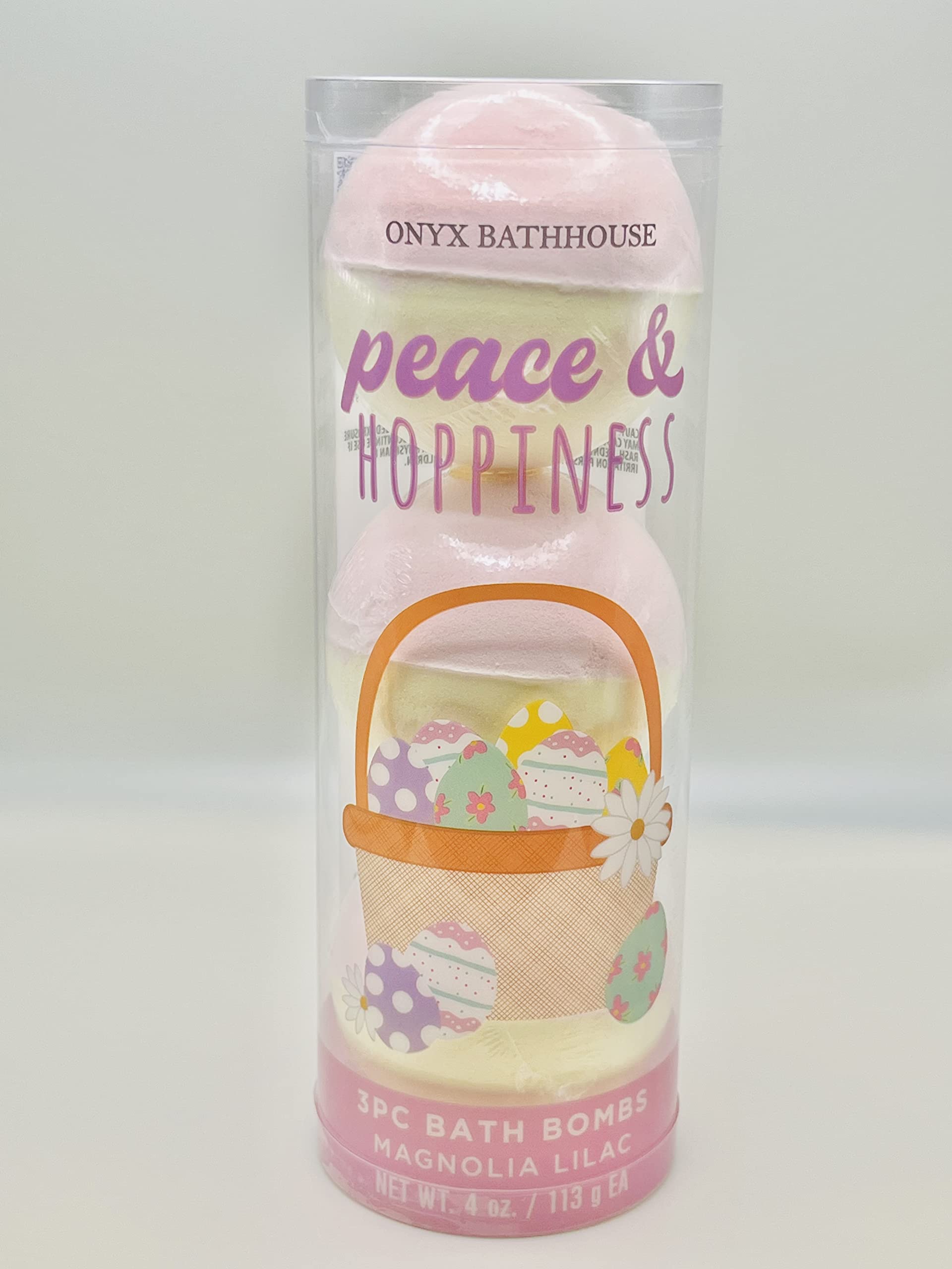 Onyx Bathhouse Peace & Hoppiness, 3 Piece Bath Bomb set, 4 Ozs! These 3 Oversized Bath Bombs are bursting with Magnolia Lilac scents! If you enjoy the Lightly Fruity (citrus-like or lemony) Sweet Floral fragrance of Magnolia flowers, then you will Love these! The bath bombs will leave your skin feeling moisturized and lightly scented. Our bath bomb's soothing fizz and Fruity/Floral fragrance are perfect for a relaxing soak, rejuvenating the senses and cleansing the skin. Each bath ball is individually wrapped and beautifully packed to give you endless hours of relaxation. The Perfect gift for this Easter! Be creative and make an Easter Basket, they’re for all ages; not just the little ones! Include one or more of our Onyx Bathhouse Foaming Body Scrubs, a small wooden spoon, bath bombs, Onyx Bathhouse Bath Salts and an Onyx Bathhouse Body Butter! That special someone will be Awed by the gift!