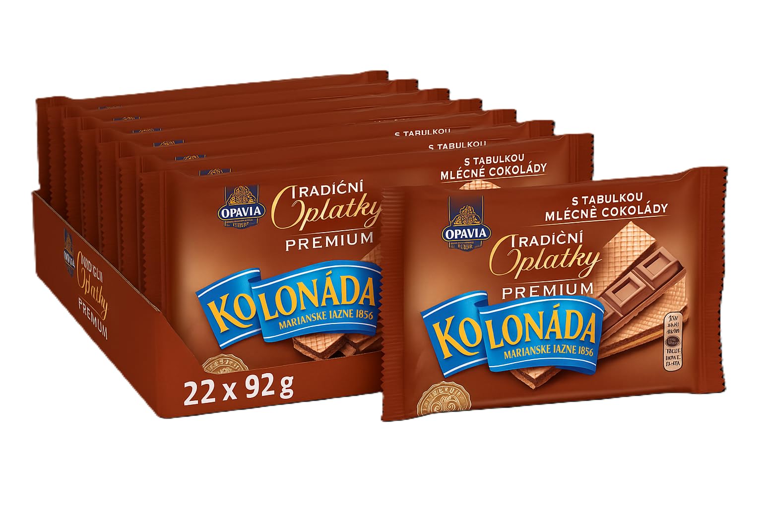 Kolonáda Premium – a touch of luxury and tradition. Since 1856, Kolonáda has stood for unique waffle art from Marienbad. With the premium milk chocolate spa waffles, you can enjoy a harmonious combination of soft, crispy waffle sheets and delicious milk chocolate. An unparalleled pleasure that combines tradition and quality. Luxury filling: each waffle contains a whole slab of soft-melting milk chocolate. Tradition since 1856: Original Czech specialty with cult status Versatile enjoyment: perfect for coffee, tea or as a sweet snack. Large pack: 22 pieces of 92 g – ideal for sharing with family and friends. Quality from the EU: carefully selected ingredients for maximum enjoyment. Treat yourself to a moment of pure relaxation with Kolonáda premium spa waffles. Order now and experience the unique taste. INGREDIENTS milk chocolate 73 [sugar, cocoa butter, cocoa mass, skimmed milk powder, whey permeate (from milk), palm oil, milk fat, emulsifiers (E442, E476), flavouring], wheat flour 28 , sugar, rapeseed oil, fat-reduced cocoa powder, raising agent (sodium carbonate), table salt, mulsifier (SO) JALECITINE). In addition to cocoa butter, milk chocolate also contains vegetable fats. May contain eggs and nuts. SAFETY WARNING The product may contain traces of nuts and contains allergens such as gluten (wheat), milk (including lactose), eggs and soy. Individuals with allergies to these ingredients should avoid this product. See moreOPAVIA Kolonáda Premium Spa-wafels melkchocolade 22 x 92 g Kolonáda Premium – een vleugje luxe en traditie. Sinds 1856 staat Kolonáda voor unieke wafelkunst uit Marienbad. Met de premium spa-wafels melkchocolade geniet je van een harmonieuze combinatie van zachte, knapperige wafelbladen en een heerlijke melkchocolade. Een ongeëvenaard genot dat traditie en kwaliteit combineert. Luxe vulling: elke wafel bevat een hele plaat van zacht smeltende melkchocolade. Traditie sinds 1856: Originele Tsjechische specialiteit met cultstatus Veelzijdig genieten: perfect voor koffie, thee of als zoete snack voor tussendoor. Grote verpakking: 22 stuks à 92 g – ideaal om met familie en vrienden te delen. Kwaliteit uit de EU: zorgvuldig geselecteerde ingrediënten voor maximaal genot. Gun jezelf een moment van pure ontspanning met Kolonáda premium spa-wafels. Bestel nu en beleef de unieke smaak. INGREDIËNTEN melkchocolade 73 [suiker, cacaoboter, cacaomassa, mageremelkpoeder, weipermeaat (van melk), palmolie, melkvet, emulgatoren (E442, E476), aroma], tarwemeel 28 , suiker, koolzaadolie, vetarm cacaopoeder, rijsmiddel (natriumcarbonaat), keukenzout, mulgator (SO) JALECITINE). Melkchocolade bevat naast cacaoboter ook plantaardige vetten. Kan eieren en noten bevatten. VEILIGHEIDSWAARSCHUWING Het product kan sporen van noten bevatten en bevat allergenen zoals gluten (tarwe), melk (inclusief lactose), eieren en soja. Personen met allergieën voor deze ingrediënten moeten dit product vermijden. Meer bekijken