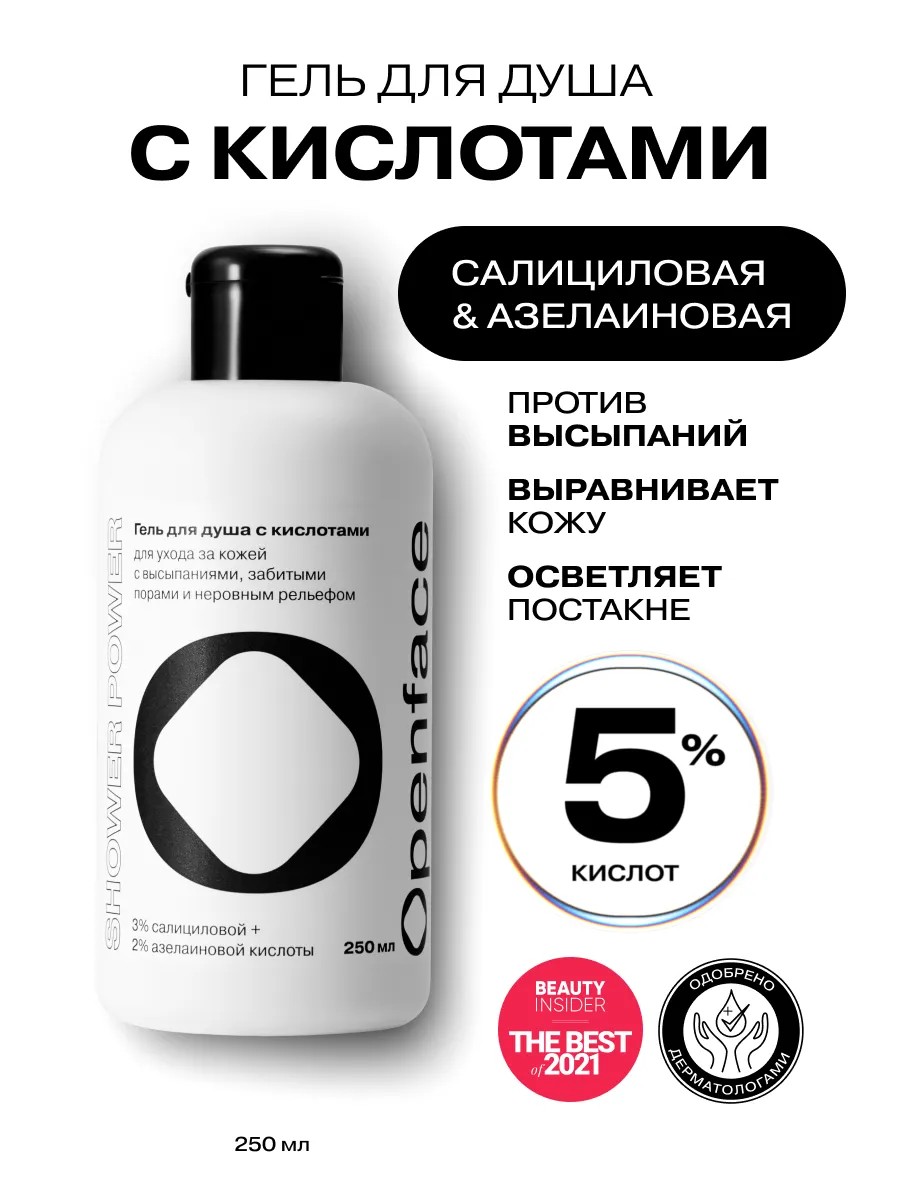 Профессиональный гель для душа от прыщей, черных точек, постакне. В составе: азелаиновая кислота поможет при акне, пигментации. Обладает отшелушивающими свойствами, справится с бактериями, вызывающими воспаления. Салициловая кислота глубоко очищает поры, борется с высыпаниями, в том числе выделяющиеся при занятии спортом, уберет видимые несовершенства. Комплекс компонентов растворит сальные пробки, снимет покраснения. Сбалансированный рН не высушит кожный покров, не вызовет раздражения. Shower Power наносится массажными движениями на все тело во время принятия ванны, избегая попадания на лицо. Оптимальная частота применения 2-3 раза в неделю. Если поверхность кожи плотная, пористая, жирная допустимо использование средства через день. Для противовоспалительного эффекта можете приобрести крем 58259926, спрей мист 60359801. После нескольких недель ваши ноги, ягодицы, спина, руки будут нежными и гладкими. Подойдет подросткам, беременным, женщинам, мужчинам для борьбы с проблемной кожей.