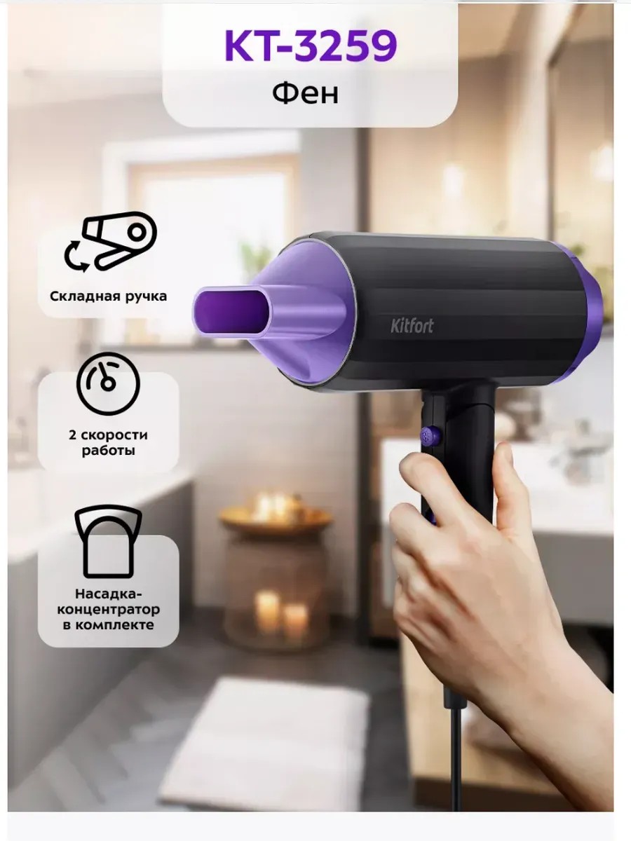 С помощью фена КТ-3259 вы сможете быстро высушить волосы и сделать красивую укладку. Фен выдаёт направленный поток воздуха, поэтому волосы с ним сушить просто, удобно и очень быстро! Кнопка включения/выключения находится на ручке фена. Устройство имеет две скорости потока воздуха. Отдельная кнопка «Холодный воздух» позволяет в любой момент включить холодный воздух из любого температурного режима. Насадка-концентратор направляет поток воздуха именно на прядь волос, позволяя ей высохнуть намного быстрее, что значительно ускоряет время укладки. Фен лёгкий и имеет складную ручку, что делает его компактным. Данную модель удобно брать с собой в поездки, путешествия и рабочие командировки. При использовании фена не закрывайте воздухозаборные отверстия и старайтесь следить, чтобы ваши волосы не попали в них. Воздухозаборные отверстия у КТ-3259 защищены сеточкой. Корпус фена выполнен из пластика, а его эргономичная ручка удобно лежит в руке. Устройство обладает мощностью 2200 Вт, благодаря чему вы сможете быстро высушить волосы и привести укладку в порядок!