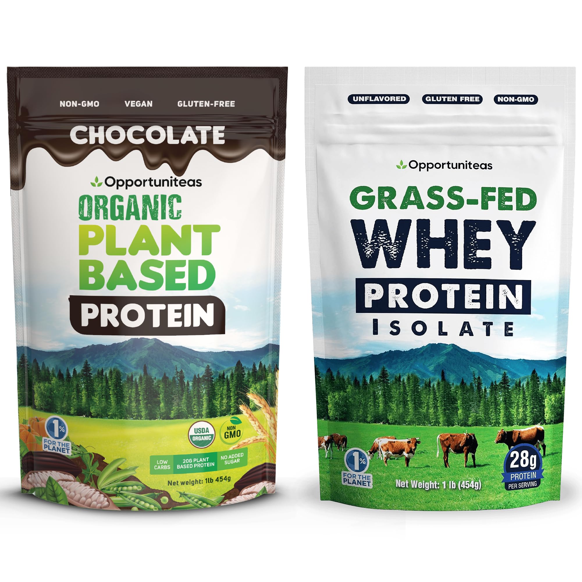 MADE THE RIGHT WAY - At Opportuniteas we make effective, transparent, and affordable products you can confidently recommend to your family. We are committed to making a positive impact on people and our planet. As a proud member of the 1 for the Planet network we donate 1 of our profits to help solve our planet's most pressing issues. If you don't love our product, we offer a no-questions-asked full refund. 28 grams of delicious Whey Protein - Opportuniteas offers one of the highest protein concentrations ensuring you get the protein your muscles need. If you are striving to build lean muscle, recover faster, or simply live a healthier lifestyle, this is for you. Mix it up with your shake, smoothie, drink, juice, or even add it to your cooking or baking recipes. Enjoy it however you like it and elevate your well-being. Easy Digestion Absorption Boost - Our unique blend of organic proteins undergo a natural process of sprouting and fermenting, allowing for easier digestion, absorption, and utilization of nutrients, maximizing the health benefits for your body. This Protein Powder is environmentally friendly, hypoallergenic, non-GMO, and free of gluten, soy, and cholesterol. Unflavored Whey Isolate Ingredients - Simple ingredients means no upset stomach! Our ingredient list is 99 pure isolate protein powder and less than 1 non-GMO sunflower lecithin for easy mixing. You're getting the essential nutrients your body needs to thrive without any artificial fillers or flavors to get in the way. Organic Planted-based Protein Ingredients - Our Organic Vegan Protein Powder is made from only the highest quality USDA Certified Organic ingredients. It's a blend of Pea, Pumpkin, and Rice protein, Heirloom Criollo Cacao, and a pinch of Stevia. Many plant-based brands use a long list of ingredients with hidden artificial substances to enhance flavor and shelf life, increg the risk of upsetting your stomach. Our formula is clean and simple, with no hidden ingredients.