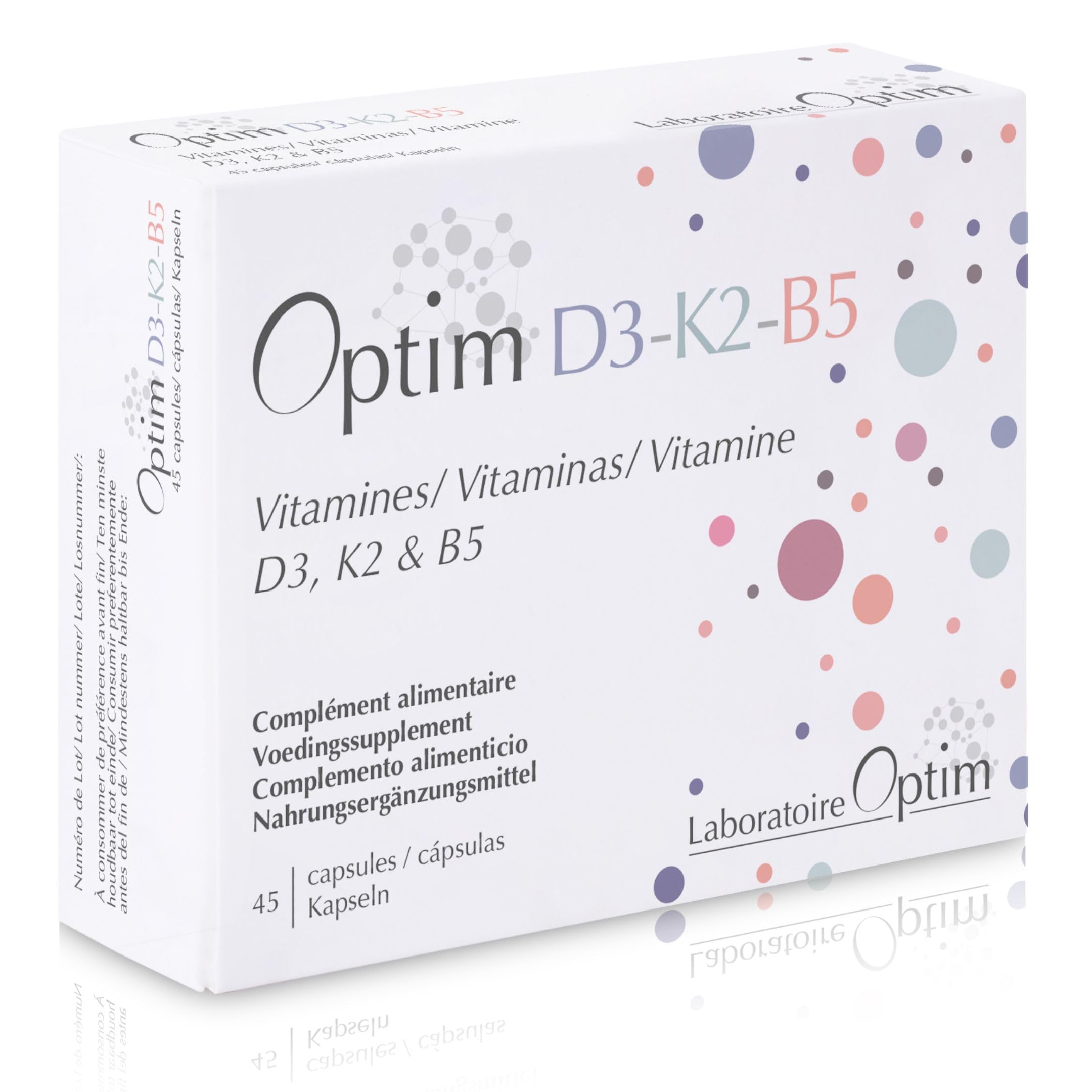 PREMIUM QUALITY VEGAN, FREE FROM COMMON ALLERGENS, MADE IN BELGIUM: Belgian manufacturing according to ISO22000 standards. Available in pharmacies in Belgium. Product notified in France. NATURALLY SOURCED VITAMINS D3 AND K2: Vitamin D3 is of plant origin extracted from lichen, and vitamin K2 MK-7 is obtained through the natural fermentation of Bacillus subtilis Natto for optimal bioavailability. SIMPLE ROUTINE FOR ACTIVE WOMEN: 1 capsule per day with a meal. 45-day supply for regular use as part of a wellness routine designed to support the hormonal transition. Easy-to-swallow capsules, suitable for daily intake. CLEAN, VEGAN FORMULA: 100 plant-based vitamin D3 from lichen, natural K2 MK-7 from fermentation, vegan capsules. Gluten-free, GMO-free, lactose-free, and free of unnecessary additives. DAILY IMMUNITY AND VITALITY: Vitamin D contributes to the normal function of the immune system. Vitamin B5 contributes to the reduction of tiredness and fatigue and to normal energy-yielding metabolism, a valuable support during the hormonal fluctuations of perimenopause. BONES AND CALCIUM - A PRIORITY AFTER 40: Vitamin D contributes to the normal absorption and utilization of calcium. Vitamin K2 contributes to the maintenance of normal bones. A key combination to preserve bone health when needs increase. SPECIALLY FORMULATED FOR WOMEN 40 : Designed to support the nutritional needs of women during perimenopause. A D3-K2-B5 synergy developed to support essential intake when bone and immune needs change.QUALITÉ PREMIUM VEGAN, SANS ALLERGÈNES COURANTS, FABRIQUÉ EN BELGIQUE: Fabrication belge selon norme ISO22000. Disponible en Pharmacie en Belgique. Produit notifié en France. VITAMINES D3 ET K2 D'ORIGINES NATURELLES: La vitamine D3 est d'origine végétale extraite du lichen et la vitamine K2 MK-7 est obtenue par fermentation naturelle du Bacillus subtilis Natto pour une biodisponibilité optimale. ROUTINE SIMPLE POUR FEMMES ACTIVES: 1 gélule par jour pendant un repas. Format 45 jours pour une utilisation régulière dans une routine bien-être destinée à accompagner la période de transition hormonale. Gélules faciles à avaler, adaptées à une prise quotidienne. FORMULE CLEAN, VEGAN: Vitamine D3 100 végétale issue de lichen, K2 MK-7 naturelle issue de fermentation, gélules vegan. Sans gluten, sans OGM, sans lactose, sans additifs superflus. IMMUNITÉ ET VITALITÉ AU QUOTIDIEN: La vitamine D contribue au fonctionnement normal du système immunitaire. La vitamine B5 contribue à réduire la fatigue et à un métabolisme énergétique normal, un soutien appréciable lors des variations hormonales de la périménopause. OSSATURE ET CALCIUM - PRIORITÉ APRÈS 40 ANS: La vitamine D contribue à l'absorption et à l'utilisation normales du calcium. La vitamine K2 contribue au maintien d'une ossature normale. Une combinaison clé pour préserver le capital osseux au moment où les besoins se renforcent. SPÉCIALEMENT FORMULÉ POUR LES FEMMES 40 : Conçu pour accompagner les besoins nutritionnels des femmes en période de périménopause. Une synergie D3-K2-B5 développée pour soutenir les apports essentiels lorsque les besoins osseux et immunitaires évoluent.OPTIM D3 K2 B5 – Vitamine D3 Vegan 1000 UI K2 MK-7 B5 – Complément Alimentaire pour Femme 40 Périménopause – Ossature Immunité – Formule Synergique – 45 Gélules – Qualité Belgique – Vegan