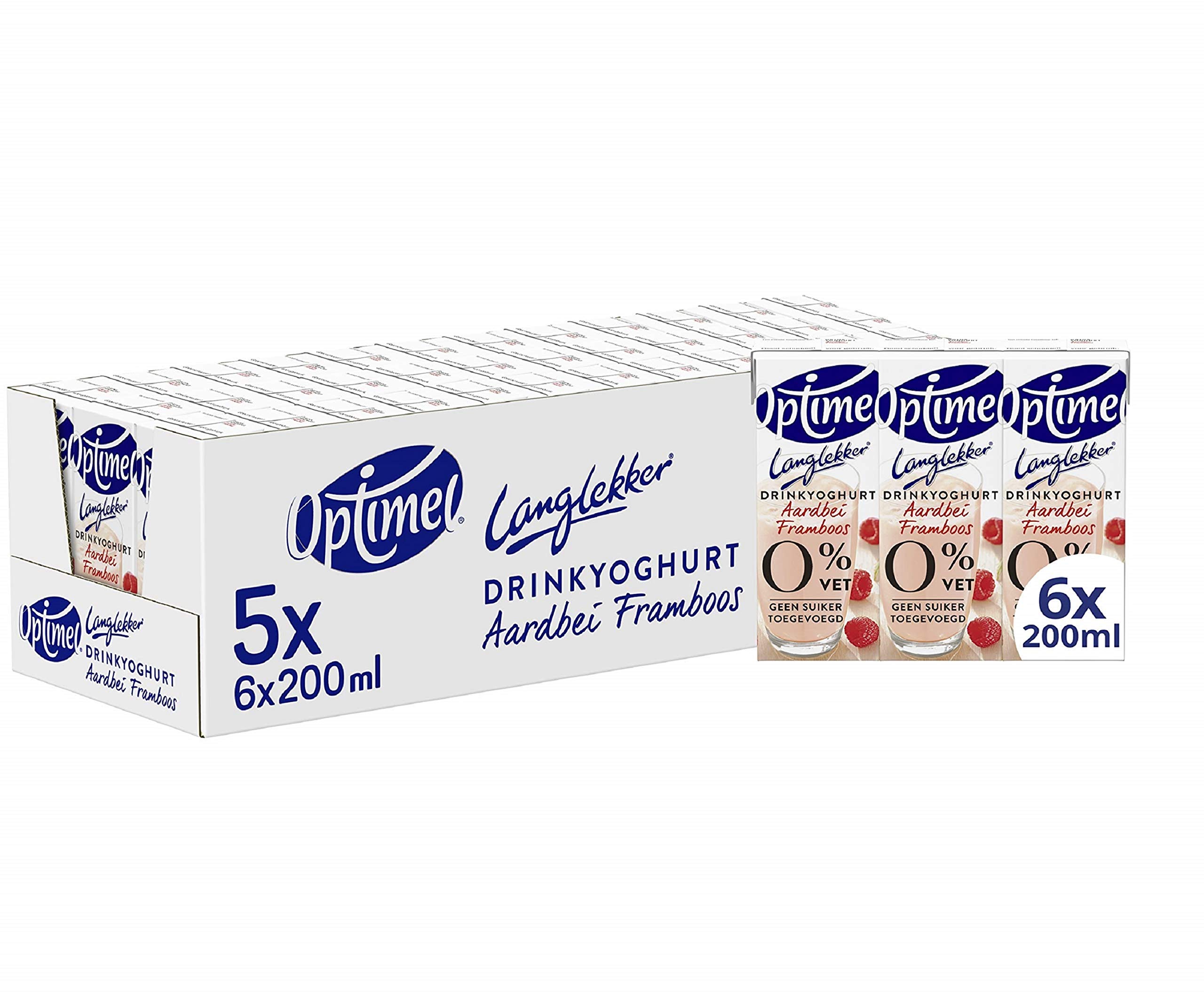 Feel good in your own skin! Optimel Langlekker drinking yoghurt contains 0 fat and no added sugars. That is enjoyment without guilt. Everywhere, because these small packages are ideal to take to work or school. Handy, right? Additional information The updated Optimel long-tasting drinking yoghurt now contains even more yoghurt. This makes Optimel a natural source of calcium and protein. Calcium is good for your bones and protein contributes to the growth and maintenance of your muscles. INGREDIENTS Ingredients: Low-fat YOGURT, liquid MILK ingredients, 2 fruit juice (1 strawberry, 1 raspberry), modified corn starch, stabilizer: pectin, flavoring, sweetener: sucralose INSTRUCTIONS FOR USE Shake well before use. SAFETY WARNING Store in the refrigerator after opening and consume within 3 days. MANUFACTURER CONTACT INFORMATION Reply number 390 3800 VB Amersfoort See moreOptimel Drinkyoghurt Aardbei Framboos 5 x 6 x 200 ml Lekker in je vel! Optimel Langlekker drinkyoghurt bevat 0 vet en geen toegevoegde suikers. Dat is genieten zonder schuldgevoel. Overal, want deze kleine verpakkingen zijn ideaal om mee te nemen naar werk of school. Handig, toch? Extra informatie De vernieuwde Optimel langlekker drinkyoghurt bevat nu nóg meer yoghurt. Dat maakt Optimel van nature een bron van calcium en proteïne. Calcium is goed voor je botten en proteïne draagt bij aan de groei en onderhoud van je spieren. INGREDIËNTEN Ingrediënten: Magere YOGHURT, vloeibare MELKbestanddelen, 2 vruchtensap (1 aardbei, 1 framboos), gemodificeerd maïszetmeel, stabilisator: pectine, aroma, zoetstof: sucralose GEBRUIKSAANWIJZING Goed schudden voor gebruik. VEILIGHEIDSWAARSCHUWING Na opening in de koelkast bewaren en binnen 3 dagen consumeren. CONTACTINFORMATIE FABRIKANT Antwoordnummer 390 3800 VB Amersfoort Meer bekijken