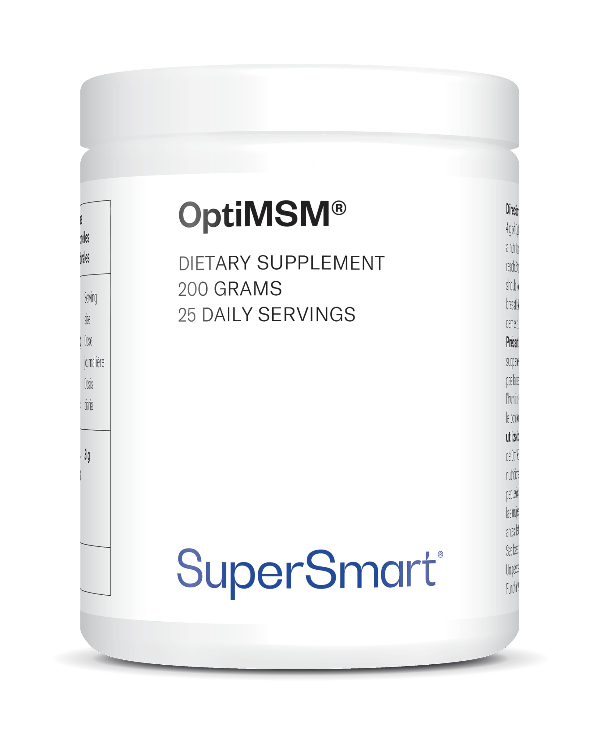 SATISFACTION GUARANTEED: We strive to offer you a range of highly effective products, along with exceptional customer service. If you have any questions or concerns, please feel free to contact us at any time. We are here to help you become the best version of yourself. DIRECTIONS FOR USE: For optimal effect, simply dissolve 1 2 to 2 teaspoons of OptiMSM powder in a glass of water or fruit juice. Take between 2 and 8 g per day. This product is a nutritional supplement and should not be used as a substitute for a balanced and varied diet or a healthy lifestyle. NATURAL INGREDIENTS: MSM is a molecule found naturally in the human body and certain foods. MSM supplements are always synthetic, but thanks to our unique manufacturing method, our molecule is the same as that found in nature. THE PUREST AND SAFEST MSN SUPPLEMENT EVER ON THE MARKET: Sulfur is a key element for the body's health. Sulfur supplements, like OptiMSM powder, can be beneficial for various health conditions such as respiratory infections and certain skin conditions. ? SUPERSMART: With 31 years of expertise, we are one of the leading brands in Europe to market dietary supplements. Our formulas are developed by a Doctor of Microbiology and Immunology. With hundreds of thousands of satisfied customers, Supersmart is a key player in the nutritional supplement industry.SATISFACTION GARANTIE : Nous mettons tout en œuvre pour vous proposer une gamme de produits hautement efficaces, tout en vous offrant un service client exceptionnel. Si vous avez des questions ou des préoccupations, n'hésitez pas à nous contacter à tout moment. Nous sommes là pour vous aider à devenir la meilleure version de vous-même. CONSEIL D'UTILISATION : Pour un effet optimal, diluez simplement 1 2 à 2 cuillères à café de poudre OptiMSM dans un verre d'eau ou de jus de fruit. Prenez entre 2 et 8 g par jour. Ce produit est un supplément nutritionnel et ne doit pas être utilisé en remplacement d'une alimentation équilibrée et variée, ni d'un mode de vie sain. DES INGRÉDIENTS NATURELS : La MSM est une molécule que l'on retrouve naturellement dans le corps humain et certains aliments. Les suppléments en MSM sont toujours synthétiques mais grâce à notre méthode de fabrication unique, notre molécule est la même que l'on retrouve dans la nature. LE SUPPLÉMENT MSN LE PLUS PUR ET LE PLUS SÉCURISÉ JAMAIS COMMERCIALISÉ : Le soufre est un élément clé pour la santé de l'organisme. Les suppléments de soufre, comme la poudre d'OptiMSM, peuvent être bénéfiques pour différentes conditions de santé telles que les infections respiratoires, et certaines affections cutanées. ? SUPERSMART : 31 ans d'expertise, nous sommes l'une des premières marques en Europe à commercialiser des compléments alimentaires. Nos formules sont mises au point par un Docteur en microbiologie et en immunologie. Avec des centaines de milliers de clients satisfaits, Supersmart figure comme un acteur incontournable de la supplémentation nutritionnelle.OptiMSM 200 G (Méthyle-sulfonyl-méthane) - Confort Articulaire - Aide à Atténuer les Douleurs Articulaires - Soufre Organique - Sans OGM - Vegan - Supersmart