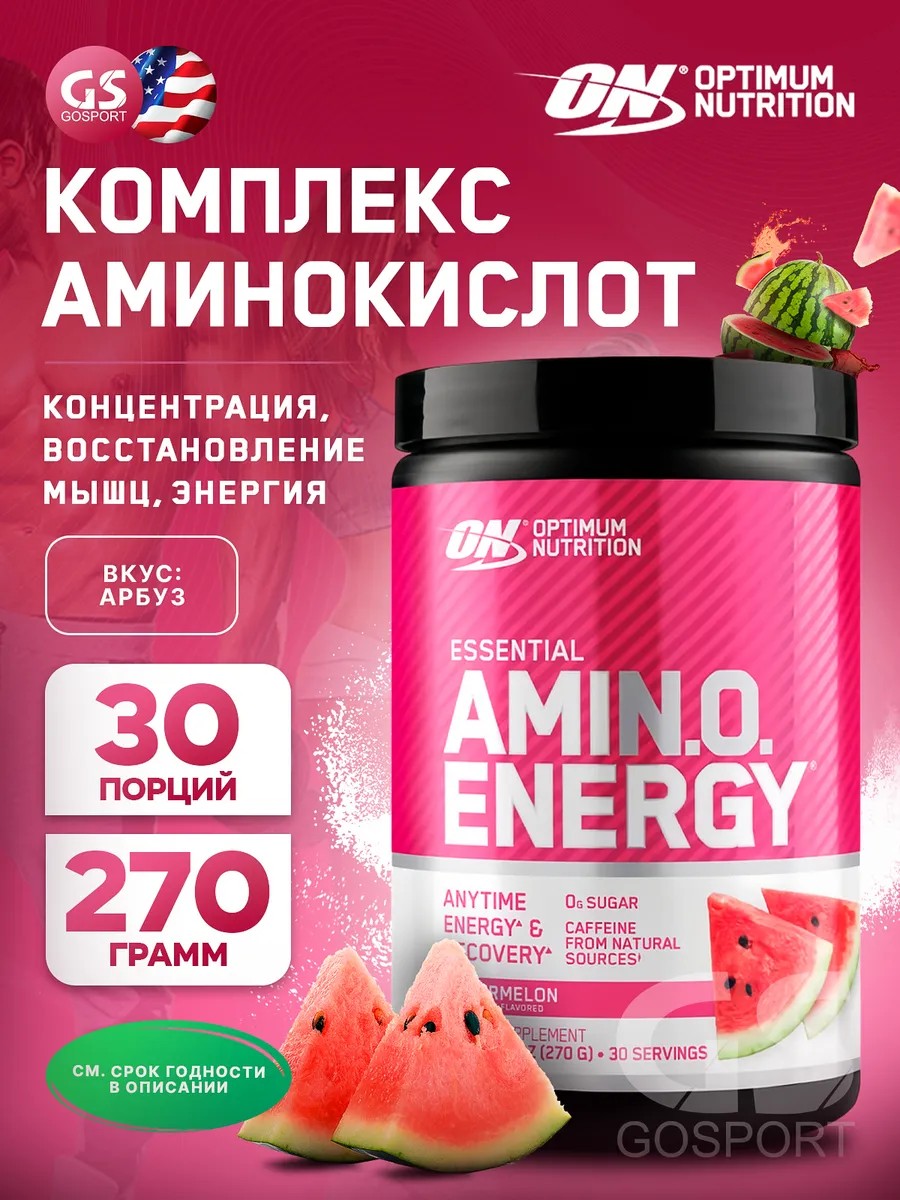 Годен до 17.07.2026. Аминокислоты Essential Amino Energy 270 г, Арбуз. Аминокислотный комплекс Essential Amino Energy, сочетает в себе оптимальное соотношение быстро абсорбирующихся аминокислот в свободной форме с природными антидепрессантами и компонентами, выступающими в качестве NO-бустеров (усилителей выработки оксида азота). Благодаря такому насыщенному компонентному составу комплекс аминокислот Essential Amino Energy в значительной степени улучшает выносливость и восстановление. Благодаря аминокислотному составу, состоящему в основном из незаменимых аминокислот (EAA), Amino Energy представляет собой отличный анаболический комплекс. Незаменимые аминокислоты способствуют развитию, нормализации и поддержанию процессов, связанных с синтезом белка, а также играют важную роль в восстановлении организма после интенсивных тренировок и нагрузок. Плюс ко всему, такие аминокислоты как BCAA и аргинин, также включенные в состав продукта, помогут вам эффективно нарастить мышечную массу и в значительной степени усилить эффект пампинга в тренировочный и посттренировочный цикл. BCAA – это еще и дополнительный источник мышечной энергии. Зелёный чай (EGCG) и экстракт зелёного кофе: сильная антиоксидантная поддержка; благодаря гликогену усиливаются процессы сжигания жира и преобразования жировых клеток в энергию. Цитруллин (микронизированный): играет важную роль в выработке энергии и борется с усталостью. Бета-аланин (микронизированный): путём очистки организма от аммиака, повышает толерантность к интенсивным физическим нагрузкам. Каждая порция Essential Amino Energy содержит всего лишь 10 калорий, исключая необходимость пересмотра основной диеты с включением данного продукта в свой рацион питания. Аминокислоты Essential Amino Energy могут стать полезным компонентом спортивного питания для спортсменов и людей, занимающихся спортом или фитнесом. Продукт подходит для мужчин и женщин, заботящихся о своем здоровье и красоте. Рекомендации по приему пищевой добавки: принимайте 2 мерных ложки (9 г) с 200 мл воды за 20 мин до тренировки, в течение дня – дополнительно 1–2 порции.