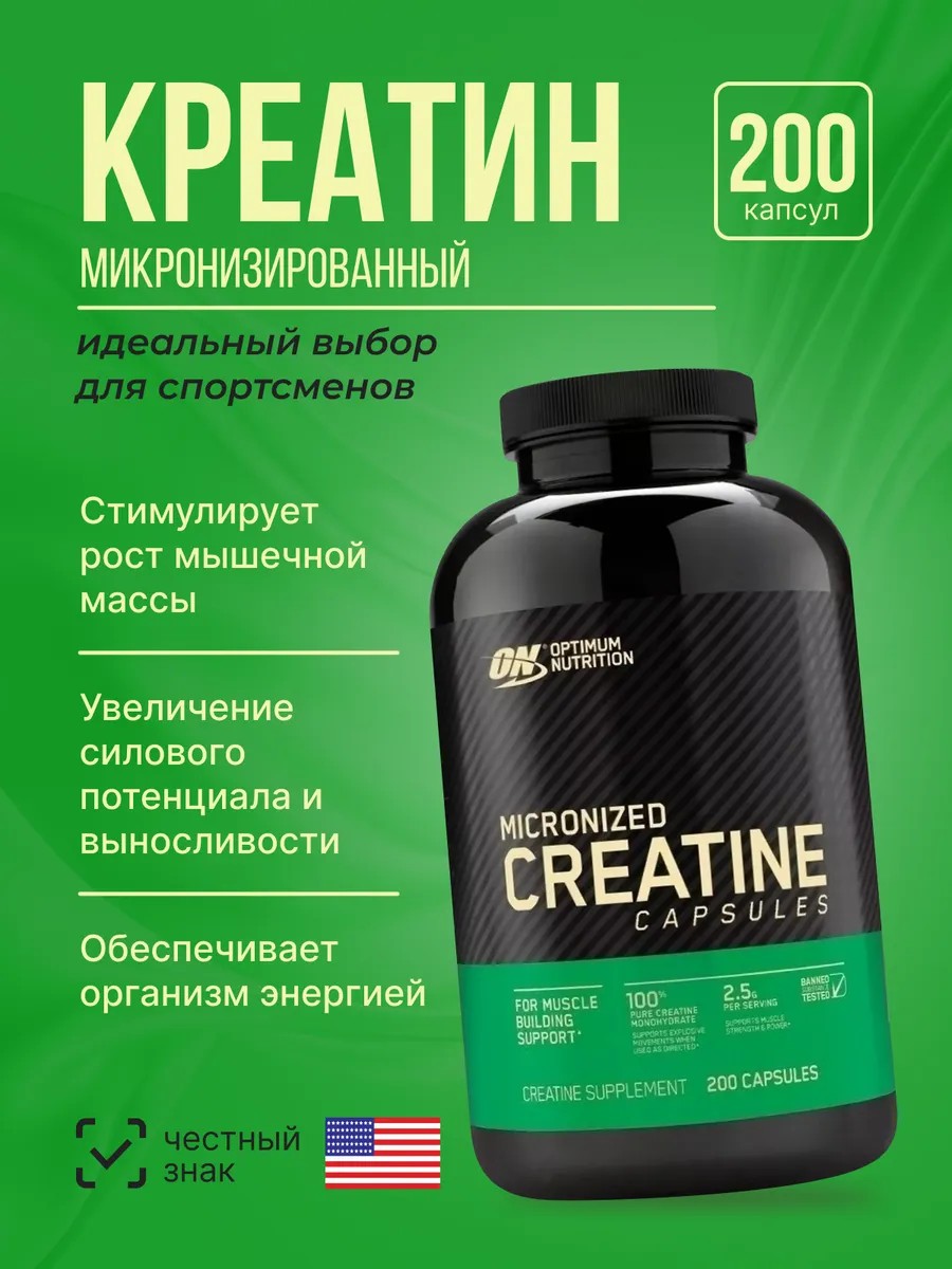 Добавка Optimum Nutrition, Моногидрат креатина, 200 капсул, представляет собой комплекс на основе креатина моногидрата в удобной капсулированной форме приёма от мирового бренда спортивного питания Optimum Nutrition. Этот продукт направлен на увеличение силового потенциала и выносливости мышечных волокон, что делает его идеальным выбором для спортсменов и фитнес-энтузиастов.