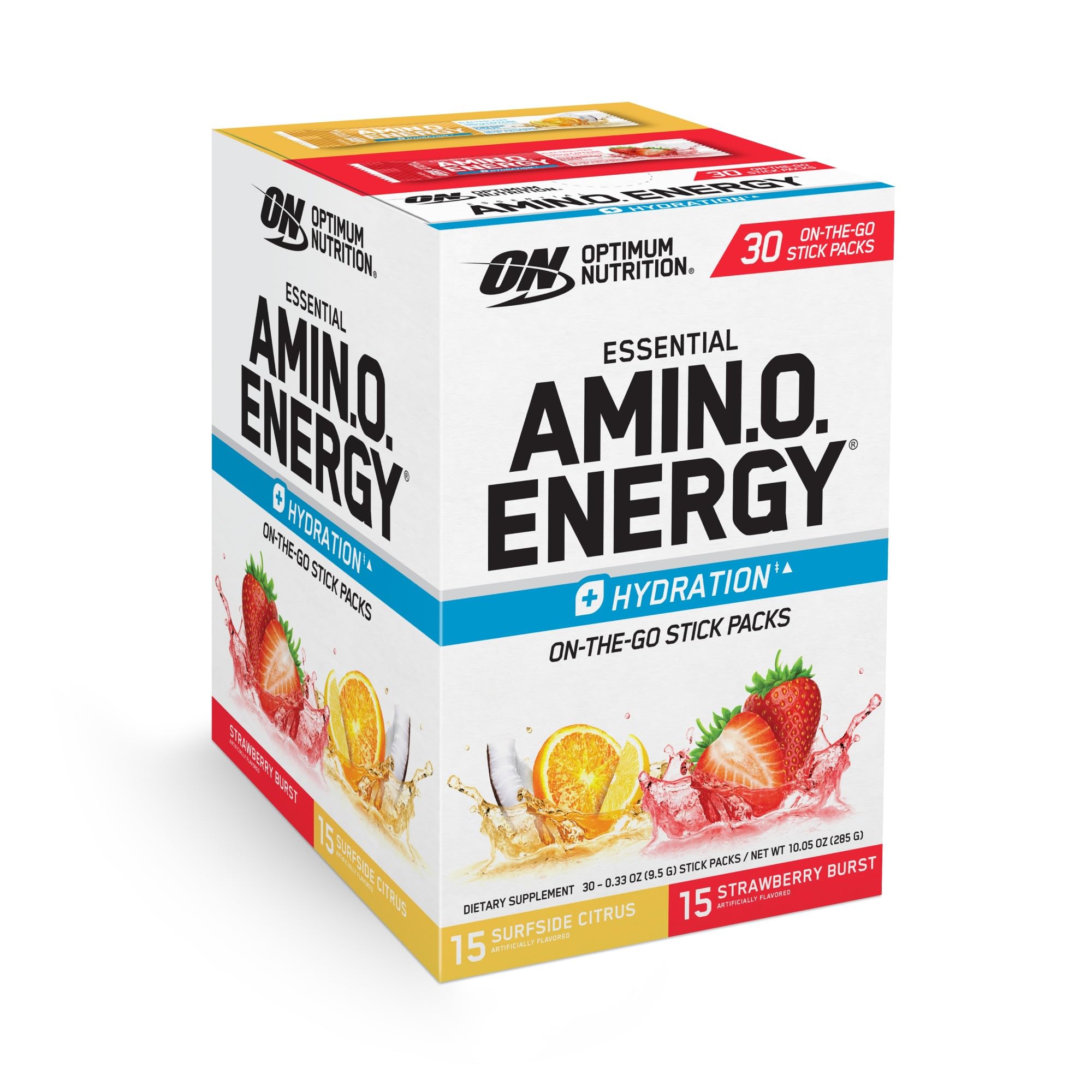 Optimum Nutrition Essential Amino Energy Plus Electrolytes Stick Packs Energy Powder Surfside Citrus and Strawberry Burst 30 Count
