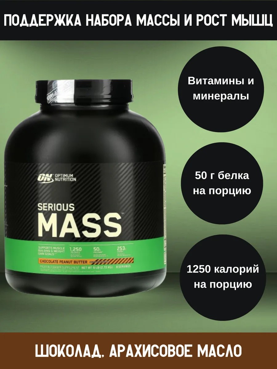 Optimum Nutrition Serious Mass (2720 г), вкус "Шоколад + арахисовое масло" — это высококалорийный гейнер, созданный для эффективного набора массы. Он идеально подходит для тех, кто хочет увеличить вес, улучшить восстановление после тренировок и поддерживать высокий уровень энергии.