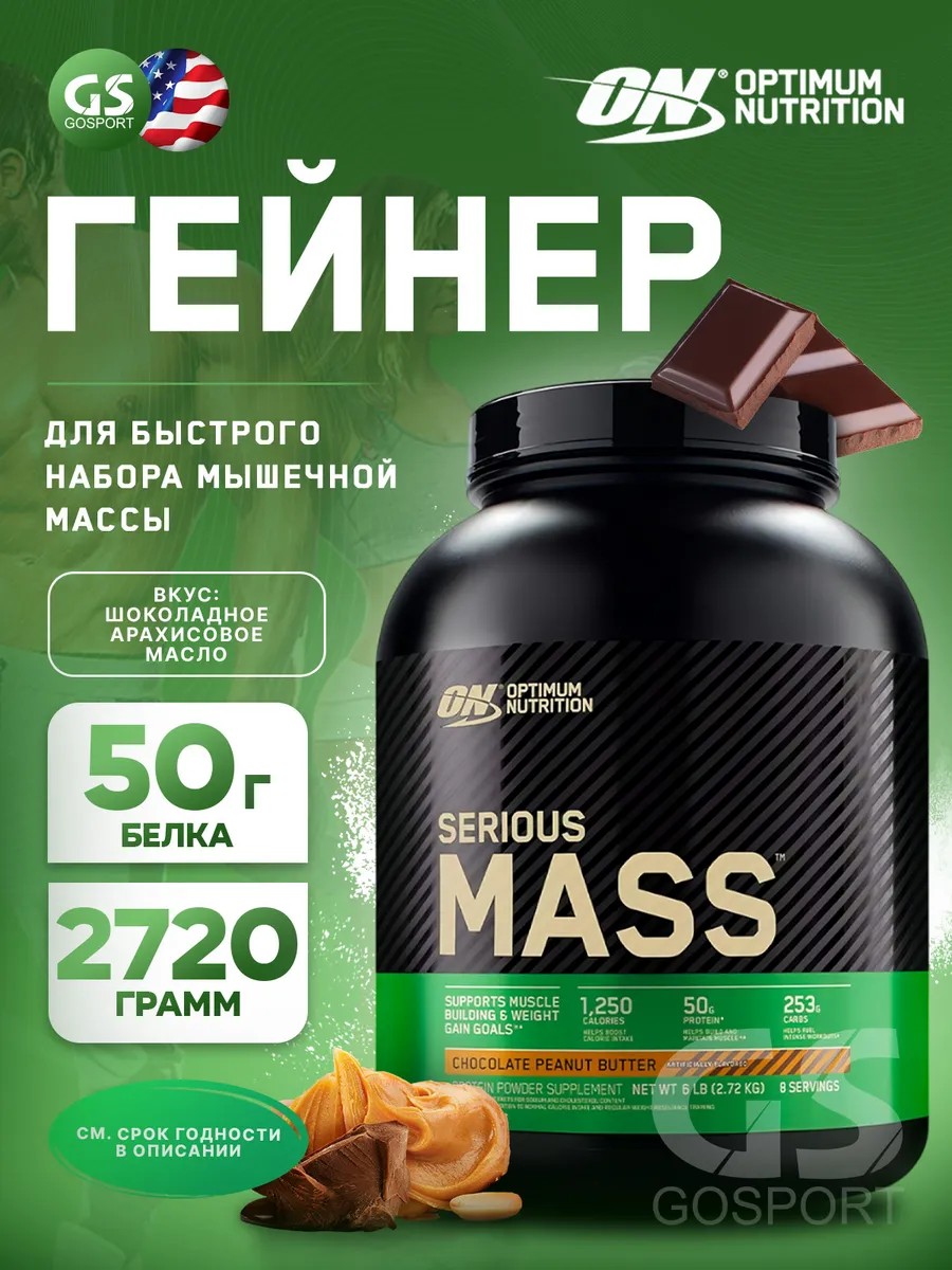 Expires until October 18, 2026. Serious Mass Gainer, 2720 g, Chocolate Peanut Butter. Serious Mass Gainer for Muscle Mass and Weight Gain. This sports product will be your reliable assistant in achieving your fitness goals. With Serious Mass, you will get the necessary amount of protein, carbohydrates, micronutrients, and calories, which will help you gain weight quickly. One of the main features of the Serious Mass gainer is its high protein concentration. The protein blend contained in this product will allow you to get the maximum amount of protein necessary for muscle building. The protein blend, which is part of the Serious Mass gainer, provides your body with the amino acids necessary for muscle growth and recovery after training. Serious Mass Gainer also contains BCAAs (amino acids), which promote more efficient protein synthesis and accelerate muscle recovery. This allows you to train more intensely and achieve better results. A carbohydrate blend provides immediate energy and increases endurance during intense strength training. Creatine serves as a source of energy for muscle work and helps distribute energy. Creatine monohydrate increases strength and endurance and helps build muscle mass faster. This sports nutrition can be used not only for weight gain but also as an additional source of BCAA amino acids and creatine. Serious Mass Gainer from Optimum Nutrition is a component of professional sports nutrition for athletes and those involved in sports or fitness. The product is suitable for men and women who care about their health and beauty. Directions for use: Add two scoops of Serious Mass to 680 ml of cold water or milk. During the first week, consume only half a serving.