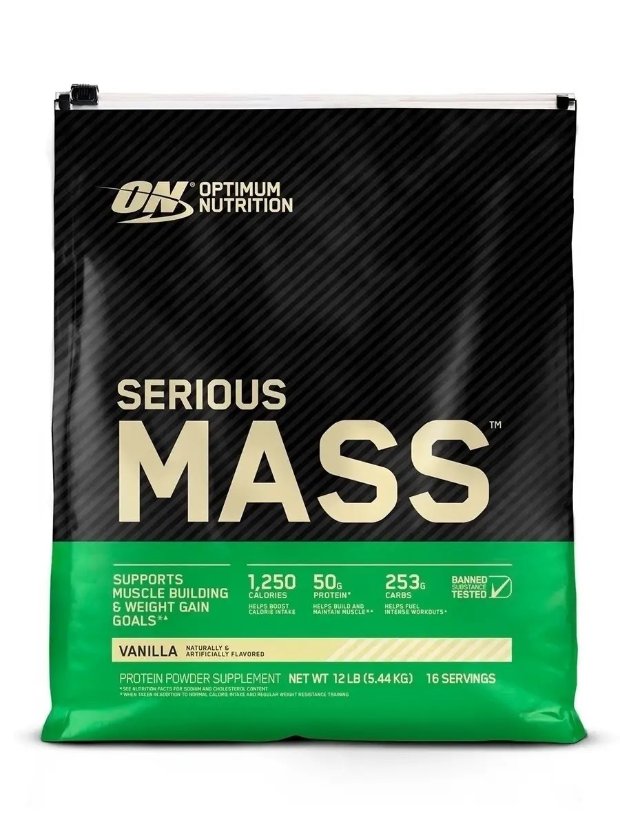 SЕRIOUS MASS от компании Optimum Nutrition - это белково-углеводный продукт для набора массы. Этот многокомпонентный гейнер является комплексом высококачественной белковой смеси (сывороточный протеин, казеинат кальция, яичный альбумин) и углеводов. Содержит: 250 гр. углеводов, 50 гр. белка, 25 витаминов и необходимых минералов, креатин, L-глютамин и пептиды. Моногидрат креатина, глютамин, холин и инозитол в составе помогают более эффективно провести тренировку. Принимать утром или во второй половине дня, до или после тренировки. Основные свойства: компенсирует дефицит калорийности питания, помогает в наборе мышечной массы, восполняет запасы гликогена после тренировки. Его выбирают: люди, кому из-за особенностей обмена веществ крайне затруднительно получить необходимую калорийность из обычной пищи, кроссфитеры и спортсмены циклических видов спорта, некоторым из которых рекомендуется получать по 6-8 граммов углеводов на 1 кг. веса в день, ценители эталонного качества от ON.