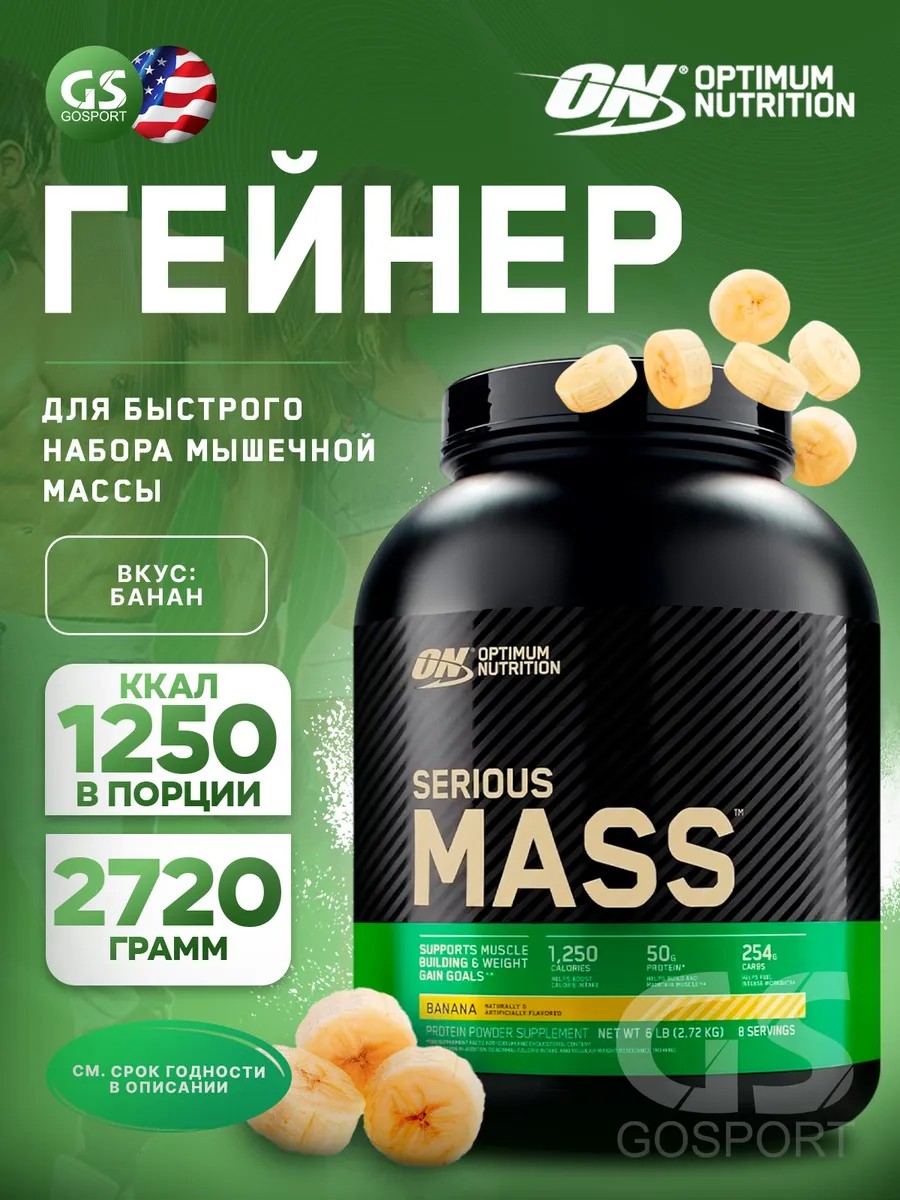 Годен до 03.01.2027. Гейнер Serious Mass 2720 г, Банан. Гейнер для набора мышечной массы и веса Serious Mass. Этот спортивный продукт станет вашим надежным помощником в достижении ваших фитнес целей. С помощью Serious Mass вы получите необходимое количество протеинов, углеводов, микроэлементов и калорий, что поможет Вам быстро набрать вес. Одной из главных особенностей гейнера Serious Mass является его высокая концентрация белка. Белковая смесь, содержащаяся в этом продукте, позволит вам получить максимальное количество белка, необходимого для наращивания мышц. Белковый смесь, которая входит в состав гейнера Serious Mass, обеспечивает ваш организм аминокислотами, необходимыми для роста мышц и восстановления после тренировок. Гейнер Serious Mass также содержит в себе БЦАА (аминокислоты), которые способствуют более эффективному синтезу белка и ускоряют процесс восстановления мышц. Это позволяет вам тренироваться более интенсивно и получать лучшие результаты. Углеводная смесь обеспечивает немедленное поступление энергии и повышает выносливость во время интенсивных силовых тренировок. Креатин служит источником энергии для работы мышц и помогает распределить энергию. Моногидрат креатина увеличивает силу и выносливость и помогает быстрее набрать мышечную массу. Этот спортпит можно использовать не только для набора веса, но и как дополнительный источник аминокислот BCAA и креатина. Гейнер Serious Mass от Optimum Nutrition является компонентом профессионального спортивного питания для спортсменов и людей, занимающихся спортом или фитнесом. Продукт подходит для мужчин и женщин, заботящихся о своем здоровье и красоте. Рекомендации по приему пищевой добавки: добавляйте из расчета две ложки Serious Mass на 680 мл холодной воды или молока. В течение первой недели можно употреблять только половину порции.