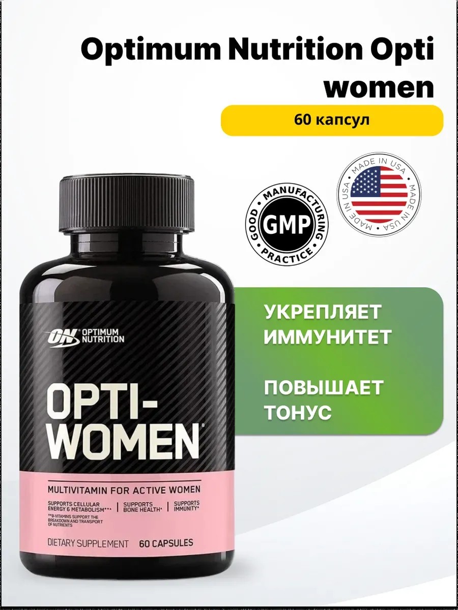 Optimum Nutrition Opti-Women - комплекс витаминов и минералов для женщин. Продукт состоит из 4-х смесей, снабжающих организм 75 необходимыми элементами. В каждой порции содержится аминокислотный комплекс, антиоксиданты, минералы и витамины, растительные компоненты, необходимые для нормальной работы организма. Комплекс разработан специально для женщин, которые ведут активный образ жизни, занимаются фитнесом, бегом и другими видами спорта. Органические соединения, содержащиеся в добавке, нормализуют ход важных обменных процессов, позволяют снизить вес, набрать мышечную массу, ускорить реакции биохимического типа. Optimum Nutrition Opti-Women оказывает общеукрепляющий эффект, усиливает иммунный барьер, стимулирует умственную, физическую и сексуальную активность.
