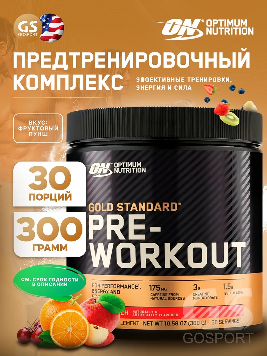 Expires until August 29, 2026. Gold Standard Pre-Workout 300 g, Fruit Punch. Pre Workout Gold Standard by Optimum Nutrition is an innovative pre-workout complex made from proven and safe ingredients. Before a workout, it is important to properly prepare your body for the upcoming loads, and Pre-Workout Gold Standard is an ideal assistant in this regard. It is guaranteed to improve performance during workouts, as well as increase strength, endurance, mental focus and reduce fatigue due to: caffeine from natural sources (tea and coffee beans) to increase energy supply and concentration; beta-alanine helps muscles neutralize lactic acid, thereby fighting fatigue and increasing the duration of training; creatine monohydrate for the production of ATP - the main source of energy for working muscles. The more ATP is produced, the more intense the contractions, and the longer you can train; Citrulline malate to increase nitric oxide (NO) levels in the blood. This in turn leads to the rapid transport of oxygen and nutrients throughout the body; acetyl carnitine promotes the rapid transport of fatty acids into cell mitochondria, which are ultimately converted into energy; Astragina, a blend of natural ingredients, astragalus root extract and panax ginseng root extract. Pre Workout Gold Standard can be a useful component of professional sports nutrition for athletes and people involved in sports or fitness. The product is suitable for men and women who care about their health and beauty. Directions for use: Mix 1 scoop with 170-230 ml of cold water and shake for 30 seconds before drinking. Take 15-30 minutes before training. Take consistently over a long period of time in conjunction with a well-balanced diet and exercise program.
