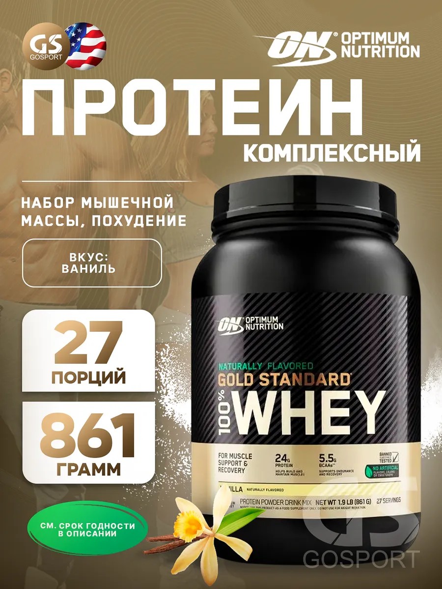 Годен до 27.11.2027. Сывороточный протеин Naturally Flavored Gold Standard 100% Whey 861 г, Ваниль. Не упустите возможность улучшить свою физическую форму и достичь новых высот в тренировках с помощью качественного сывороточного протеина OPTIMUM NUTRITION Gold Standard 100% Whey. Протеин - это основной строительный блок нашего организма. Он необходим для роста и восстановления мышц, поэтому так важно получать достаточное количество высококачественного белка. Gold Standard 100% Whey предлагает вам комплекс протеиновых компонентов - изолят сывороточного протеина, концентрат сывороточного протеина, сывороточные пептиды, чтобы удовлетворить все потребности вашего организма. Главное преимущество протеина Gold Standard 100% Whey - его высокий уровень белка. Он содержит высокий уровень комплекс аминокислот ВСААs, которые являются основой для роста мышц и восстановления после тренировок. Gold Standard 100% Whey - это не просто протеиновый коктейль, это комплексное спортивное питание, разработанное специально для спортсменов и людей, активно занимающихся спортом. Он предназначен как для мужчин, так и для женщин, желающих достичь оптимальной формы. Каждая порция OPTIMUM NUTRITION Gold Standard 100% Whey - это белковая добавка, которая поможет вам достичь лучших результатов в похудении или наборе мышечной массы. Этот продукт идеально подходит для тех, кто стремится к здоровому образу жизни и улучшению своей физической формы. Преимущества Gold Standard 100% Whey не ограничиваются просто высоким содержанием белка. Он проходит процессы концентрации, ультрафильтрации, ионозамещения и перекрестной микрофильтрации, что позволяет полностью отделить холестерин и лактозу. Это делает продукт идеальным при низкожировой и низкоуглеводной диете. Белковый напиток Gold Standard 100% Whey - не содержит искусственных компонентов и вырабатывается из высококачественного молока путем низкотемпературной обработки, что позволяет сохранить биологически активные микрофракции.Этот продукт рекомендуется к употреблению профессиональными спортсменами и теми, кто стремится к долгосрочным результатам. Рекомендации по применению: принимать продукт по 1 мерной ложке 2-3 раза в день. Для наилучших результатов следует принимать продукт по 1-2 мерных ложки в течение 45 минут после высокоинтенсивных тренировок, за 1 час до тренировки и с утренним приемом пищи (часто рекомендуют и прием протеиновых коктейлей через 2-3 часа после тренировки). Добавить 1-2 мерные ложки на 300-500 мл нежирного молока, воды или сока и в течение 10 секунд взбивать в миксере или ложкой, употреблять желательно сразу.
