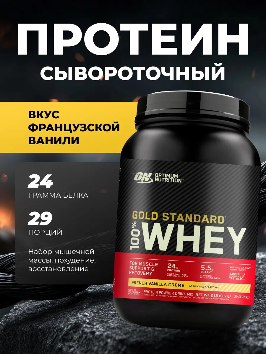 Протеин Gold Standard от Optimum Nutrition сочетает изолят и концентрат сывороточного белка с содержанием 24 г чистого белка на порцию и всего 3 г углеводов, что делает его идеальным выбором для набора мышечной массы, восстановления после тренировок и поддержания формы. Ключевые преимущества: быстрое усвоение благодаря фильтрованному изоляту Whey Protein Isolate, богатый аминокислотный профиль с 5,5 г BCAA, отличная растворимость и нежный ванильный вкус без приторности. Состав: без лишних жиров и сахара, с добавлением пищеварительных ферментов для лучшего усвоения. Форма выпуска: банка 907 г (около 30 порций). Рекомендации по применению: 1 мерная ложка (30,4 г) на 180–240 мл воды или молока после тренировки или между приемами пищи.