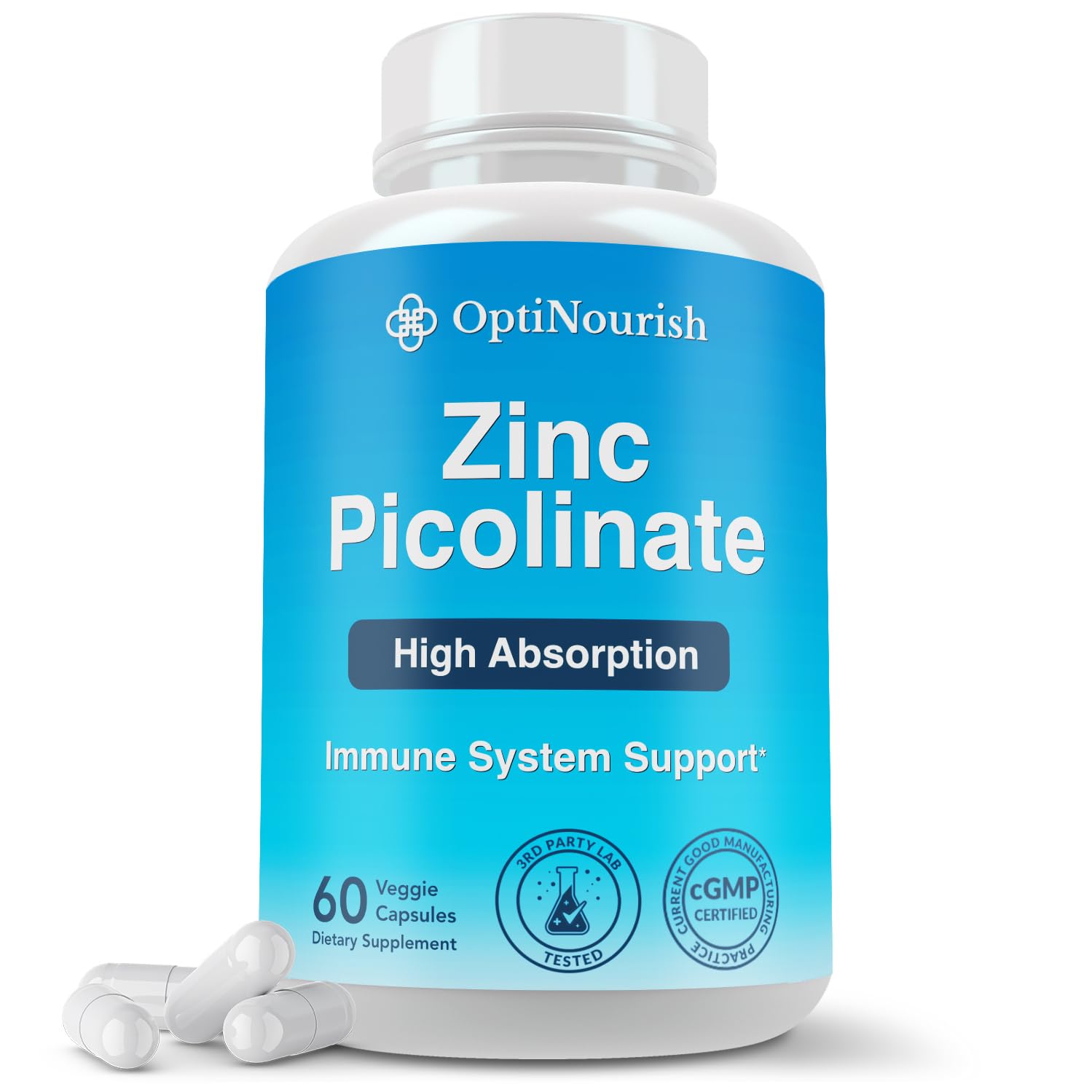 OptiNourish Zinc Picolinate 30mg High Absorption Support Immune Function Skin Muscle Memory & Metabolism Made in USA in cGMP-Certified Facility Non-GMO 60 Veggie Capsules
