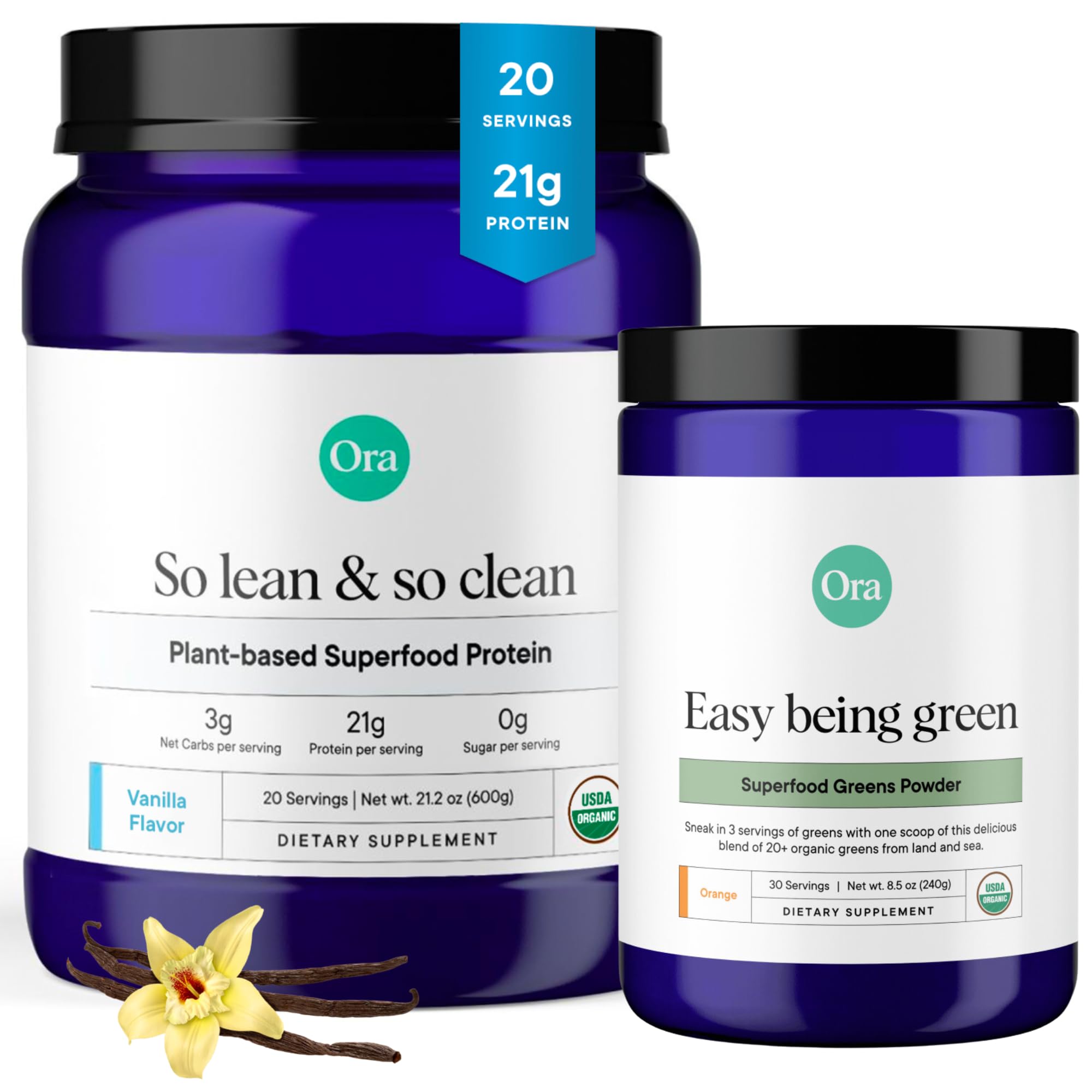 Ora Organic Greens Powder & Protein Power Bundle: 20+ Superfood Greens Blend - Citrus Flavor 30 Servings + 21g Plant Based Protein Powder Vanilla Flavor 20 Servings
