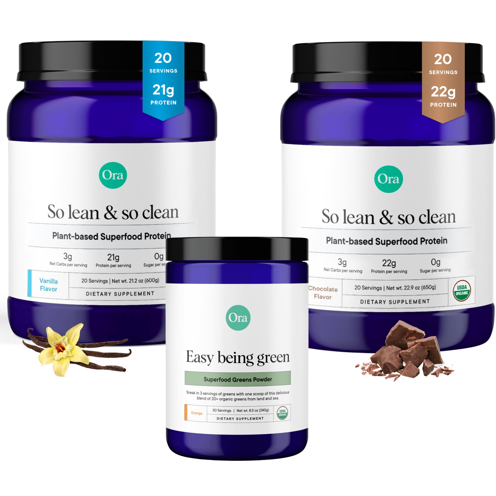 Ora Organic Vegan Protein Powder Chocolate Vanila & Greens Powder Bundle: 22g Plant Based Chocolate 20 Servings + 21g Plant Based Vanilla 20 Servings + Organic Super Greens Drink 30 Servings
