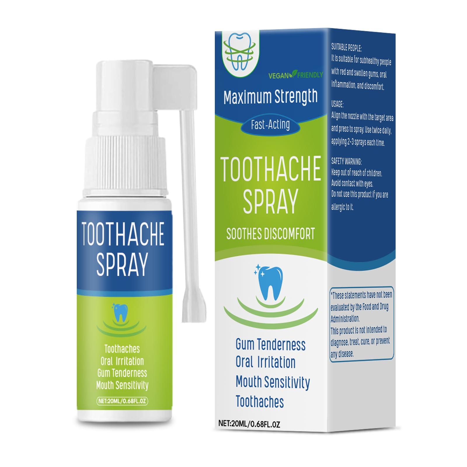 Travel-Friendly Size: Compact and lightweight, this 0.68 fl oz bottle fits easily in a pocket or bag, making it convenient to use anytime, anywhere. Easy-to-Use Nozzle Design: The rotating nozzle allows you to spray precisely where needed. Clean your mouth before use, adjust the nozzle toward the desired area, and gently press the pump. Use 2–3 sprays each time, up to 3 times a day. Daily Oral Care Support: Designed to help maintain oral comfort throughout the day, it supports a fresh, moisturized environment for your gums and mouth. Natural Botanical Blend: Crafted with clove, rose, fennel, wintergreen oil, peppermint oil, and camphor, this gentle blend creates a naturally refreshing, clean-feeling experience in your mouth without any sticky residue. Soothe Everyday Oral Discomfort: This toothache spray helps ease everyday tooth-discomfort sensations and provides a gentle, soothing feeling for your gums, leaving your mouth clean and refreshed after use.