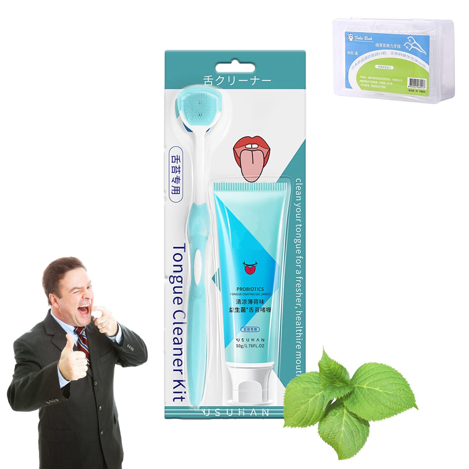 2023 New Oral Hygiene Brush & Tongue Cleansing Gel, Tongue Cleaning Brush Kit, Mint Tongue Cleansing Gel and Tongue Cleaner Brush, Tongue Scraper, Mouth Scrubber, Remove Bad Breath and Freshen Breath What makes Tongue Cleansing Gel your go-to choice? - Neutralizes and flushes healththreatening odor bacteria from the tongue. - After scraping the tongue, substances that affect the function of taste buds can be removed. - Keep a good mood every day! Together With tongue brush supports maintaining oral health & fresh breath. - Break through the sticky tongue plaque, penetrate deep into the nooks and crannies of the tongue where bad breath occurs, and eliminate bad breath naturally and safely. How to use: 1. Squeeze out an appropriate amount of tongue coating gel. 2. Turn the scraping surface of the tongue gasket over and scrape 3-5 times from the inside to the outside. 3. Rinse your mouth with water after scraping, and wash off the tongue cleaner with warm water. Specifications: Name: Oral Hygiene Brush & Tongue Cleansing Gel Net Content : 0.11lb / 50g Shelf Life : 3 years Product Function: Clean tongue coating and fresh breath Total weight .2lb / 87g Storage Method: Store in a cool dry place Applicable Scenarios: working hours, before appointments, after meals, on business trips Package includes: 1/2 Set x Probiotic Tongue Cleaning Gel Set 1PCS x Dental Floss (50PCS/BOX) Notes: 1. Due to the display and light, please focus on the actual product received. 2. Due to manual measurement, please allow an error of 1-2cm.Humanized Design: The Three-Layer Tongue Cleaning Brush is ergonomically designed to easily clean the surface of the tongue coating and other hard-to-reach areas. You'll love everywhere the brush goes because it's comfortable and confident to use Your breath is completely fresh. How to Use:1. After brushing your teeth, squeeze out an appropriate amount of tongue cleaning gel and rub it on the soft hair of the tongue cleaner to clean the tongue. 2. Turn over the scraper surface of the tongue cleaner and scrape it from inside to outside 3-5 times. 3. After use, rinse your mouth with clean water and wash the tongue cleaner with warm water. Mild and Comfortable: Mint Tongue Cleansing Gel and Tongue Cleaner Brush can protect the taste buds while cleaning the tongue coating, keep the oral fresh and healthy, and have a very good protection for human health. Comfortable texture is non-irritating, does not hurt the tongue and taste buds, natural and healthy raw materials, no harm to the human body, safe care of the oral health of the family, and can be used by the elderly and children. Natural Ingredients, Eliminate Bad Breath: Tongue Coating Cleaning Gel made of sorbose, mint, and other ingredients, safe, healthy, has no smell, and is fragrance-free. Can reduce the accumulation of tongue coating dirt and residues.It only takes ten seconds to eliminate bad breath, leaving you feeling fresher than ever before and never worrying about bad breath again. Probiotic Tongue Cleaning Gel: Designed by dentists to keep breath fresh causes. Issues with occasional bad breath? Dental research studies have proven that 90% of bad breath comes from the tongue. The professional tongue cleaner is designed to break through sticky tongue plaque and penetrate the nooks and crannies of the tongue that create bad breath, for a natural and safe elimination of bad breath. Keep the mouth fresh and healthy, and have a good protective effect on human health.