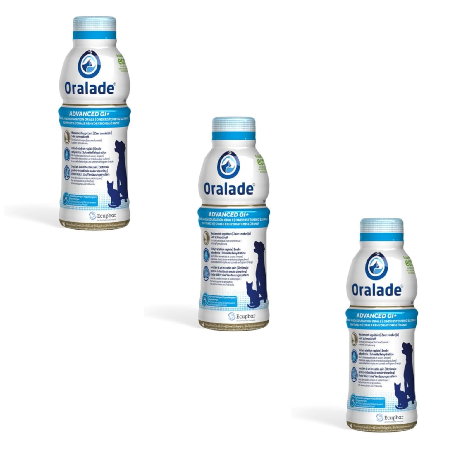 Oralade GI support is a food supplement that can help relieve acute intestinal absorption disorders and nutritional convalescence. Use it for diarrhea, during periods of recovery and stress. Also suitable for microenteral nutrition during fasting periods. It contains functional amino acids, as well as a high concentration of electrolytes and easily digestible sugars. Zero fat and little protein can help enable easy absorption and rapid digestion. Prebiotic substances can help promote microflora for good gut health. A natural chicken flavor can help entice your dog or cat to drink. INGREDIENTS Purified water, Dextrose monohydrate, Chicken liver hydrolyzate, Sodium chloride, Potassium chloride, Monosodium phosphate, Vegetable oils and fats, Natural flavor. Citrate-free and preservative-free. Crude protein 1.0 , Crude fat 0.1 , Crude fiber 0.3 , Crude ash 0.5 , Moisture 96.0 , Potassium 0.08 , Sodium 0.14 , Chloride 0.2 , Calcium 0.006 , Phosphorus 0.027 Energy value (ME) 14 kcal 100 ml✓ ORAL REHYDRATION - The isotonic solution can be rapidly absorbed and its high palatability can encourage increased fluid intake. ✓ MICROENTERAL NUTRITION - The amino acids glutamate and glycine can help nourish enterocytes quickly and efficiently and maintain the mucosal barrier. ✓ GOOD TOLERANCE - The low fat and protein content of Oralade GI Support can promote good tolerance during the first 24 hours of illness. ✓ DIETETIC FOOD SUPPLEMENT - Oralade GI Support is intended for microenteral nutrition and oral rehydration support in cats and dogs. ✓ ORALADE GI SUPPORT - Oralade GI Support liquid dietary food supplement is suitable for dogs and cats of all breeds at all life stages. Oralade GI support est un complément alimentaire qui peut aider à soulager les troubles aigus de l'absorption intestinale et à la convalescence nutritionnelle. Utilisez-le en cas de diarrhée, pendant les périodes de récupération et de stress. Convient également à la nutrition microentérale pendant les périodes de jeûne. Il contient des acides aminés fonctionnels, ainsi qu'une haute concentration d'électrolytes et de sucres facilement digestibles. Zéro graisse et peu de protéines peuvent aider à permettre une absorption facile et une digestion rapide. Les substances prébiotiques peuvent aider à promouvoir la microflore pour une bonne santé intestinale. Une saveur naturelle de poulet peut aider à inciter votre chien ou votre chat à boire. INGRÉDIENTS Eau purifiée, Dextrose monohydraté, Hydrolysat de foie de poulet, Chlorure de sodium, Chlorure de potassium, Phosphate monosodique, Huiles et graisses végétales, Arôme naturel. Sans citrate et sans conservateurs. Protéine brute 1,0 , Matières grasses brutes 0,1 , Fibre brute 0,3 , Cendres brutes 0,5 , Humidité 96,0 , Potassium 0,08 , Sodium 0,14 , Chlorure 0,2 , Calcium 0,006 , Phosphore 0,027 Valeur énergétique (ME) 14 kcal 100 ml✓ RÉHYDRATATION ORALE - La solution isotonique peut être rapidement absorbée et sa grande appétence peut encourager une augmentation de la consommation de liquide. ✓ NUTRITION MICROENTÉRALE - Les acides aminés glutamate et glycine peuvent aider à nourrir les entérocytes rapidement et efficacement et à maintenir la barrière muqueuse. ✓ BONNE TOLÉRANCE - La faible teneur en graisses et en protéines d'Oralade Soutien GI peut favoriser une bonne tolérance pendant les premières 24 heures de la maladie. ✓ COMPLÉMENT ALIMENTAIRE DIÉTÉTIQUE - Oralade Soutien GI est destiné à la nutrition microentérale et au soutien de la réhydratation orale chez les chats et les chiens. ✓ ORALADE SOUTIEN GI - Le complément alimentaire diététique liquide Soutien GI d'Oralade est adapté aux chiens et chats de toutes races à toutes les étapes de la vie.