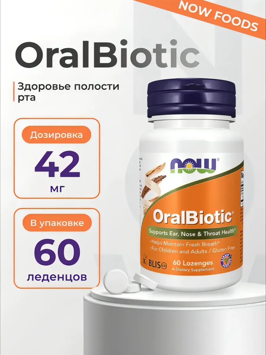 Oralbiotic 60 леденцов- биологически активная добавка от NOW Foods, предназначенная для детей и взрослых. Она содержит натуральный пробиотик, который поддерживает здоровье ротовой полости, горла. Кроме того, он обеспечивает свежее дыхание, препятствует размножению вредных бактерий. Оказывает иммуномодулирующее действие и нормализует баланс пробиотиков в организме. Нашу ротовую полость населяет множество полезных бактерий. Одной из первых, обычно еще в младенчестве, у нас появляется Streptococcus salivarius. Blis K12 - эффективный штамм S. salivarius. При регулярном приеме добавки бактерии заселяют ротовую полость и горло и помогают поддерживать естественный защитный барьер организма. Клинически доказано, что Blis K12 поддерживает здоровье рта, ушей, носа и горла у детей. При регулярном использовании Оральный Биотик помогает сохранить свежее дыхание. Рекомендации по применению OralBiotic : взрослым принимать по 2 леденца 1-4 раза в день. Детям от 2 лет принимать по 2 леденца 1-5 раз в день. Дайте леденцу медленно и полностью раствориться во рту, а затем глотайте. Детям до 2 лет использовать только по рекомендации врача. Продукт длительного хранения. После вскрытия упаковки хранить в холодильнике, чтобы увеличить срок, в течение которого продукт не будет терять свои полезные качества.