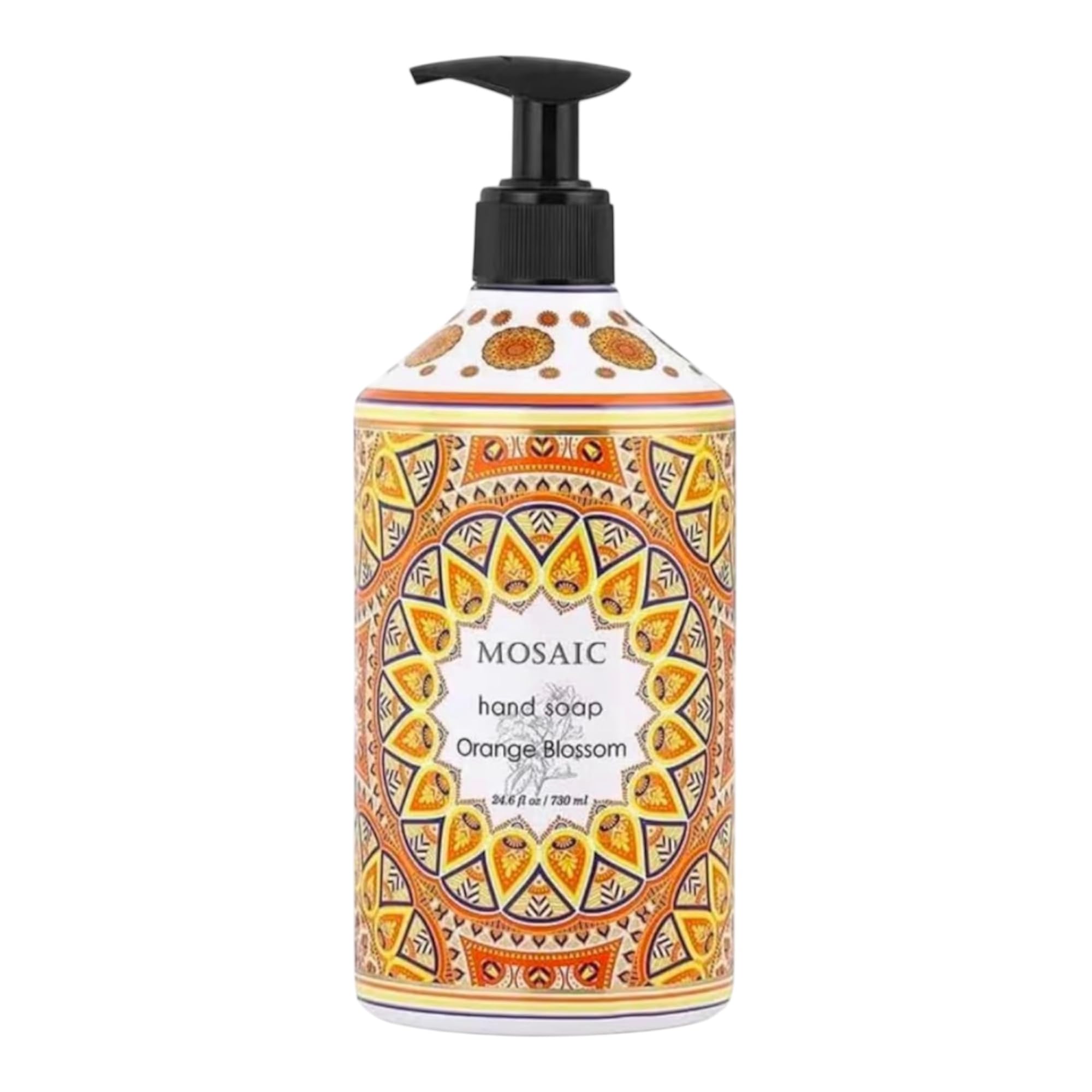 Bring a burst of freshness to your handwashing routine with this Orange Blossom Liquid Hand Soap. Blending zesty citrus and soft floral notes, this soap delivers a bright, energizing scent while gently cleansing and moisturizing your skin. The large 24.6 fl oz (730 mL) bottle offers long-lasting use and features an eye-catching mosaic design that enhances your space. Ideal for both everyday use and guests, it's a fragrant and functional addition to your kitchen or bathroom.