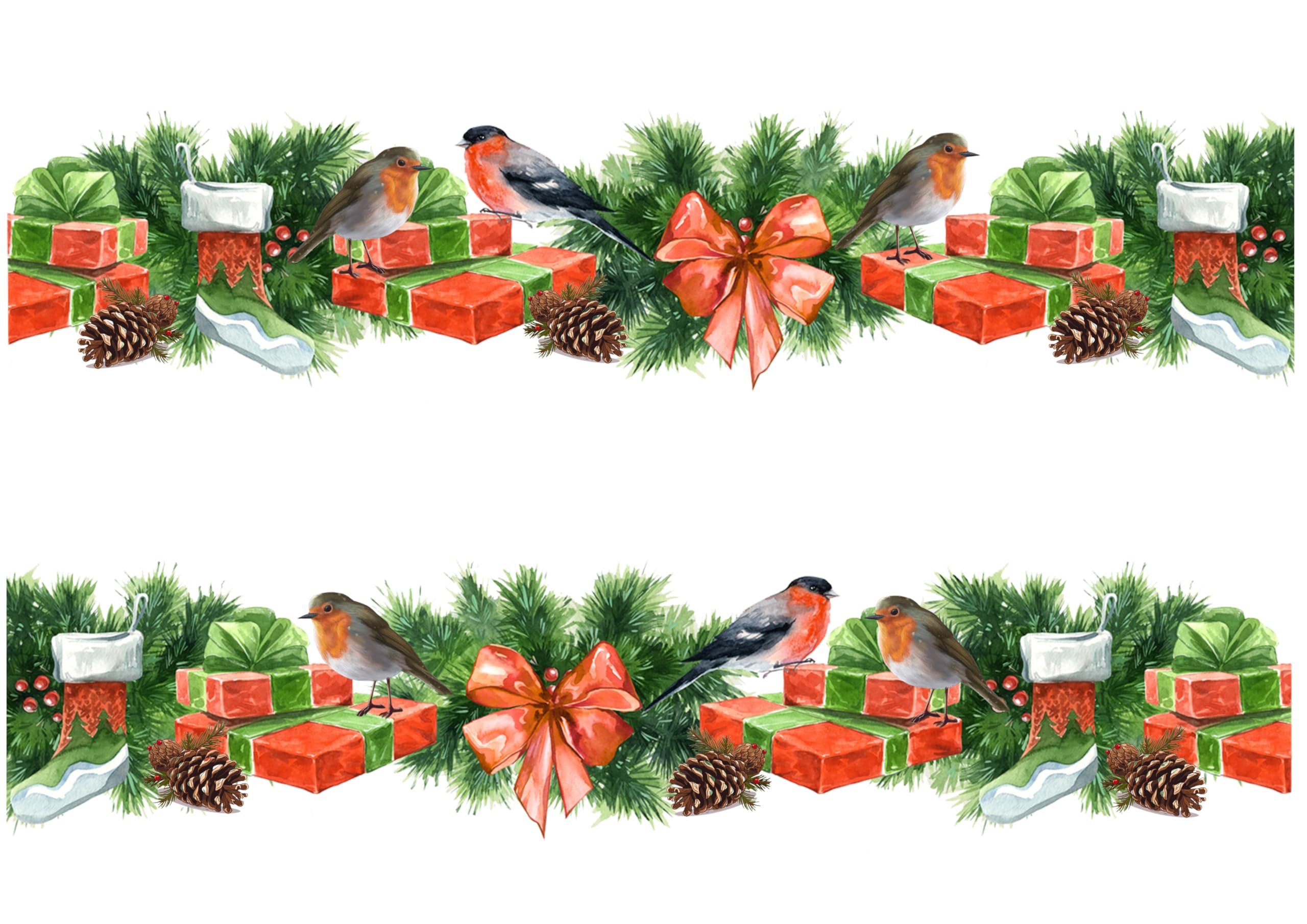 Christmas Robins Border Edible Decor Icing Sheet Cake Toppers Decorations. This border is printed on an A4 Decor icing sheet with edible inks. It's supplied on an A4 icing sheet with 2 strips (Each border length is approx 28cm long x 6cm depth) that REQUIRE CUTTING OUT. This works well on fondant iced cakes or buttercream. This item will have a plastic backing. Please remove before use. To store this product, we advice to keep flat in a cool dry place. Do not put in fridge or freezer and keep out of sunlight to avoid fading. Try to use on the day the cake is being served. This item has a best before date of 6 months from purchase date. Fully Edible Decor Sheet Ingredients - E1422,E1412,Maltodextrin,Humectant E422, Sugar, Water, Stabilizers E414,E460i, Dextrose, Emulsifiers E435, E491, E471, Flavours, Acidity Regulator E3330, Preservative E202, Sucralose.Fully Edible - Fully Edible - Fully Edible - Decor Icing Ingredients -Thickener(E1422,E1412), Maltodextrin, Hunecetant E422, Sugar, Water, Stabilizers(E414,E460i), Dextrose, Emulsifiers (E435, E491,E471), Food Colour E171, Flavours, Acidity Regulator E330, Preservative E202, Sucralose. Fully edible with a shelf life of at least 6 months from purchase if kept dry and in sealed packet. You will receive images exactly as shown in the picture and just peel off the plastic backing and place on dampened cake. This great cake topper is printed on an A4 Decor icing sheet with edible inks. Each border length is 28cm long x 6cm depth. A4 Edible Decor Icing Sheet Christmas Robins Border Edible Cake Topper Decoration - Great for larger cakes.