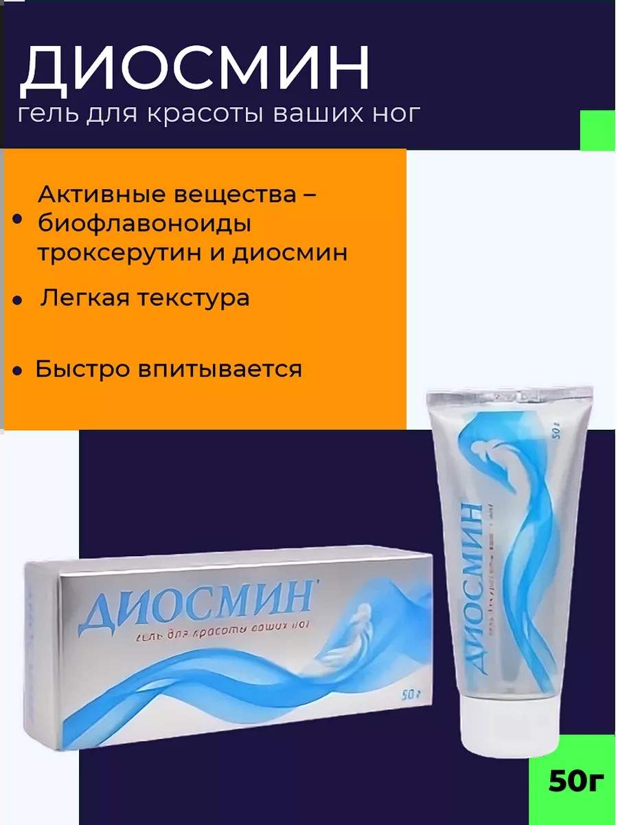 Косметическое средство для ухода за кожей ног. В состав геля Диосмин входят биологически активные вещества – биофлавоноиды троксерутин и диосмин.