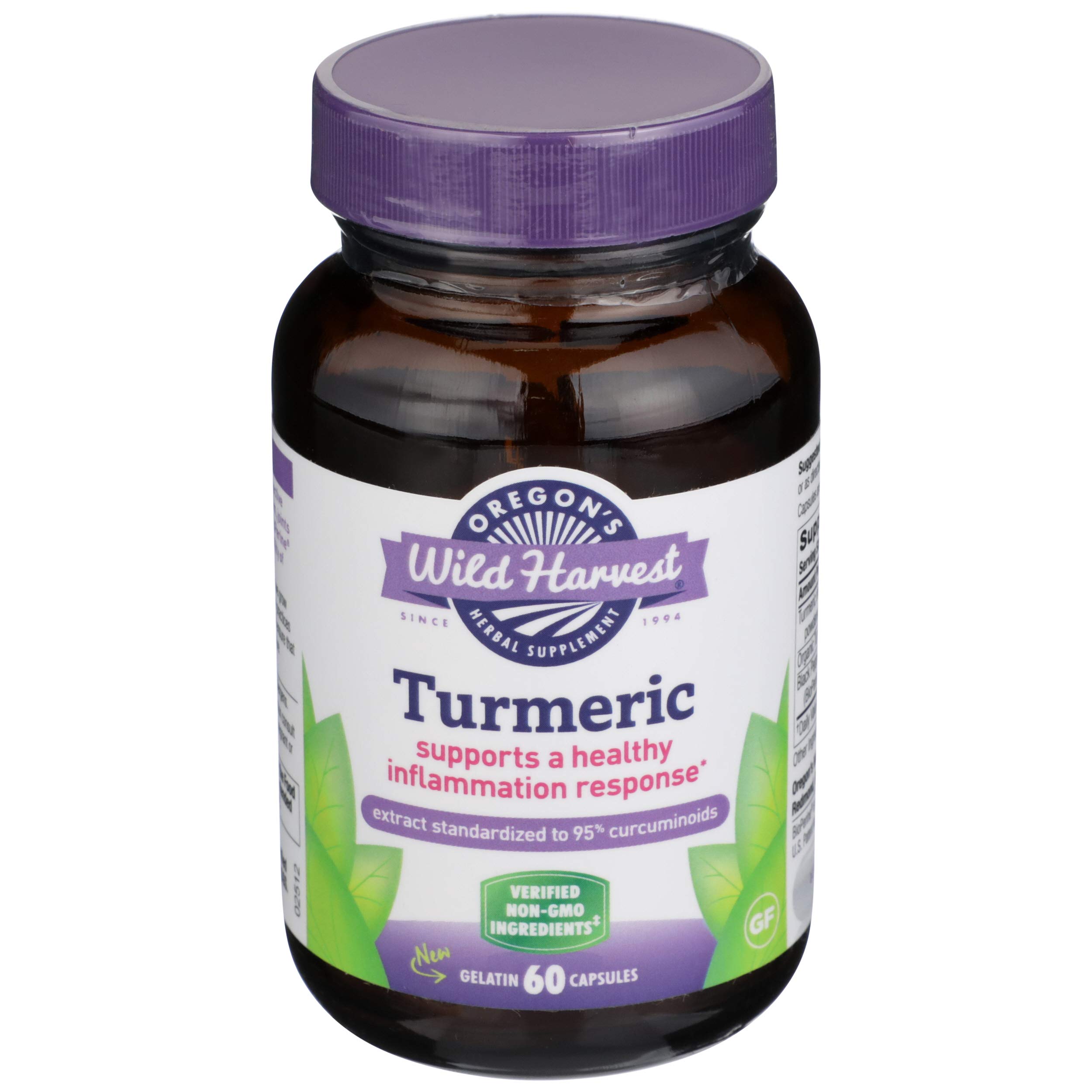 Non-GMO. Gluten-free. 60 vegetarian capsules of herbal supplement, turmeric.