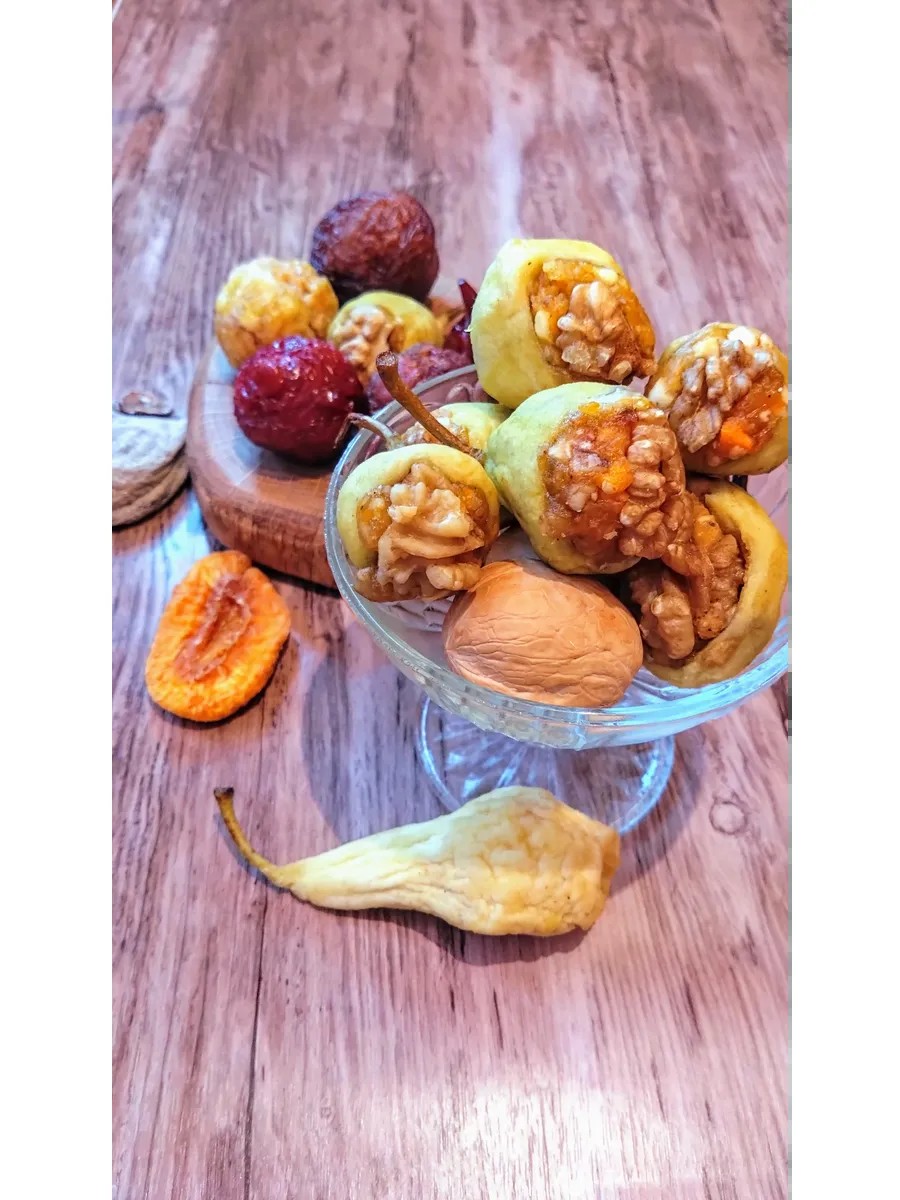 Slightly dried fruits are filled with a mixture of walnuts, natural honey (literally a couple of drops), peach, apricot, apple, cloves, figs, prunes, cinnamon and left until completely dry.