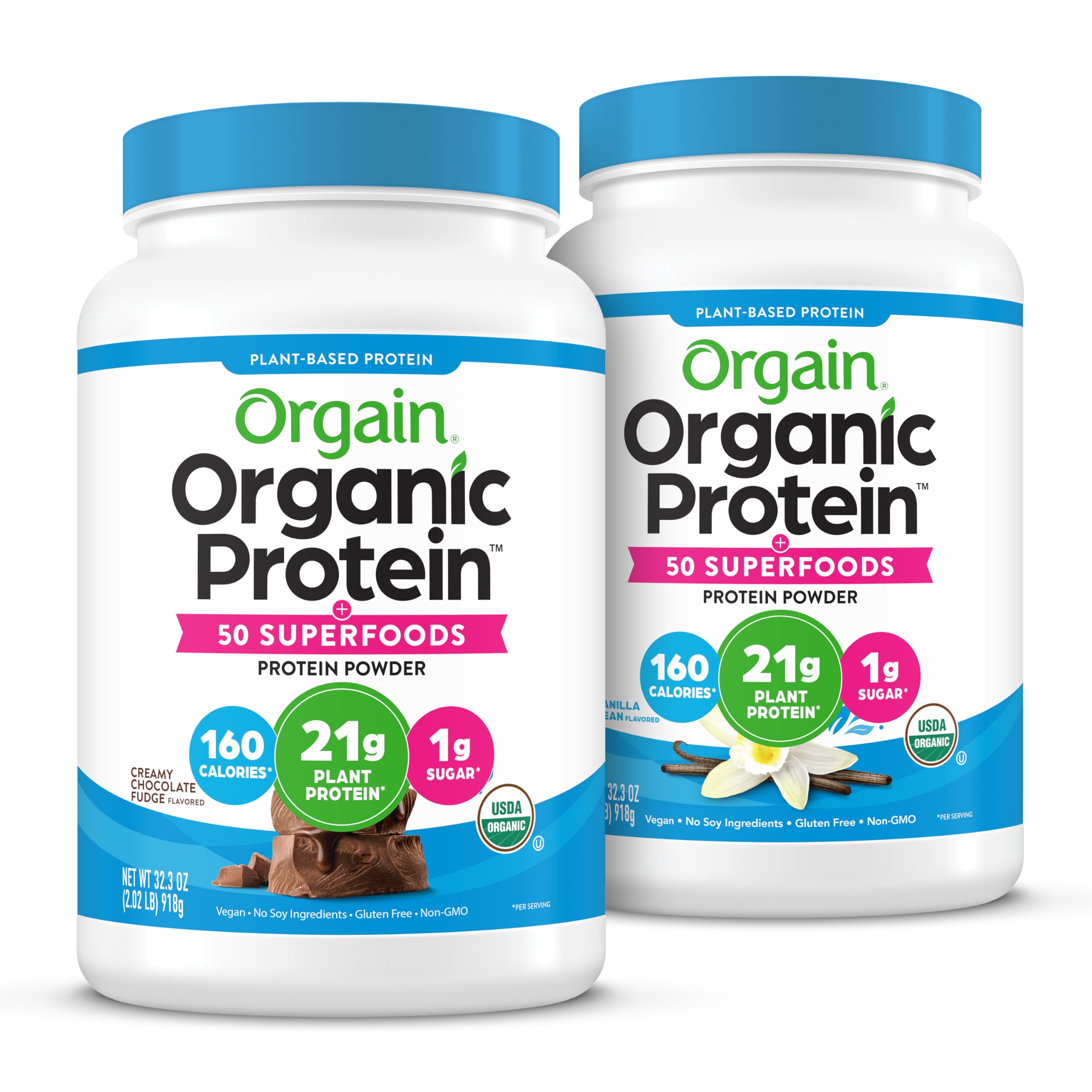 What makes Orgain the 1 plant protein powder brand in the U.S. ? Is it the smooth and creamy flavor? The delicious taste without the grit? The fact that it serves up 21 grams of organic, vegan protein optimized with 50 organic superfoods and an extra boost for maximum nutrition? Or that it's so easy to prepare? Truthfully, it's all of this and so much more. Our protein blend consists of organic peas, brown rice, and chia seeds, to provide a complete protein with all nine essential amino acids. Each serving contains 50 organic superfoods like kale, flax, broccoli, spinach, quinoa, beet, acai, and turmeric and is an excellent source of vitamin B6, vitamin C and iron to support your immune system. Not only does our plant-based protein powder serve up the tastiest, creamiest protein, but it's also made with uber clean ingredients and higher standards in mind! Enjoy a protein powder that's certified USDA organic, non-GMO, and made without soy, dairy, gluten, or artificial preservatives, sweeteners or flavors. On top of all of that, it boasts 10g of prebiotic fiber, 1g of sugar , and has 160 calories . Plus, when it comes to flavor and versatility, this powder delivers. Mix our plant-based protein powders with your favorite smoothies, almond or oat milk, and even baking mixes for to add a good, clean boost. At Orgain we celebrate taste, and we take it seriously because we recognize that part of living a vibrant life is loving what you eat. Go ahead, fuel up with the powder that's a treat for both your taste buds and your body so you can have energy to keep on going! Source: IRI, Total US MULO, Latest 52 weeks ending 10.08.23 per serving, varies by flavorWHAT TO EXPECT: Each bundle contains 1 each of Chocolate and Vanila 2.02 lb Orgain Organic Vegan Protein Powder 50 Superfoods. PERFECT FOR ANY LIFESTYLE: This protein powder is perfect for men and women alike, whether you're maintaining a healthy lifestyle, working out, looking to add more protein to your diet, following a diet regiment or an on the go meal replacement. HIGHER STANDARDS: We believe it's what's on the inside that matters most, and that includes what we left out. This product is USDA Organic, vegan, gluten-free, kosher, made without soy, and Non-GMO. You also won't find any carrageenan, lactose or dairy ingredients, artificial colors, flavors, sweeteners, or preservatives. We also use third parties to verify that we are certified USDA Organic and plant based. ORGANIC 50 SUPERFOODS BLEND: Each serving contains 50 organic superfoods like chia, tumeric, kale, flax, broccoli, spinach, quinoa, beet, acai and is an excellent source of Vitamin B6, Vitamin C and iron to support your immune system. CLEANER INGREDIENTS: 21g plant protein and 1g sugar per serving. Our Vanilla protein blend consists of Organic pea, brown rice, and chia seeds, to provide a complete protein with all nine essential amino acids. It also features 8g of Prebiotic fiber for gut support and our 50 Superfoods Blend. CLEANER INGREDIENTS: 21g plant protein and 1g sugar per serving. Our Chocolate protein blend consists of Organic pea, brown rice, and chia seeds, to provide a complete protein with all nine essential amino acids. It also features 10g of Prebiotic fiber for gut support and our 50 Superfoods Blend.