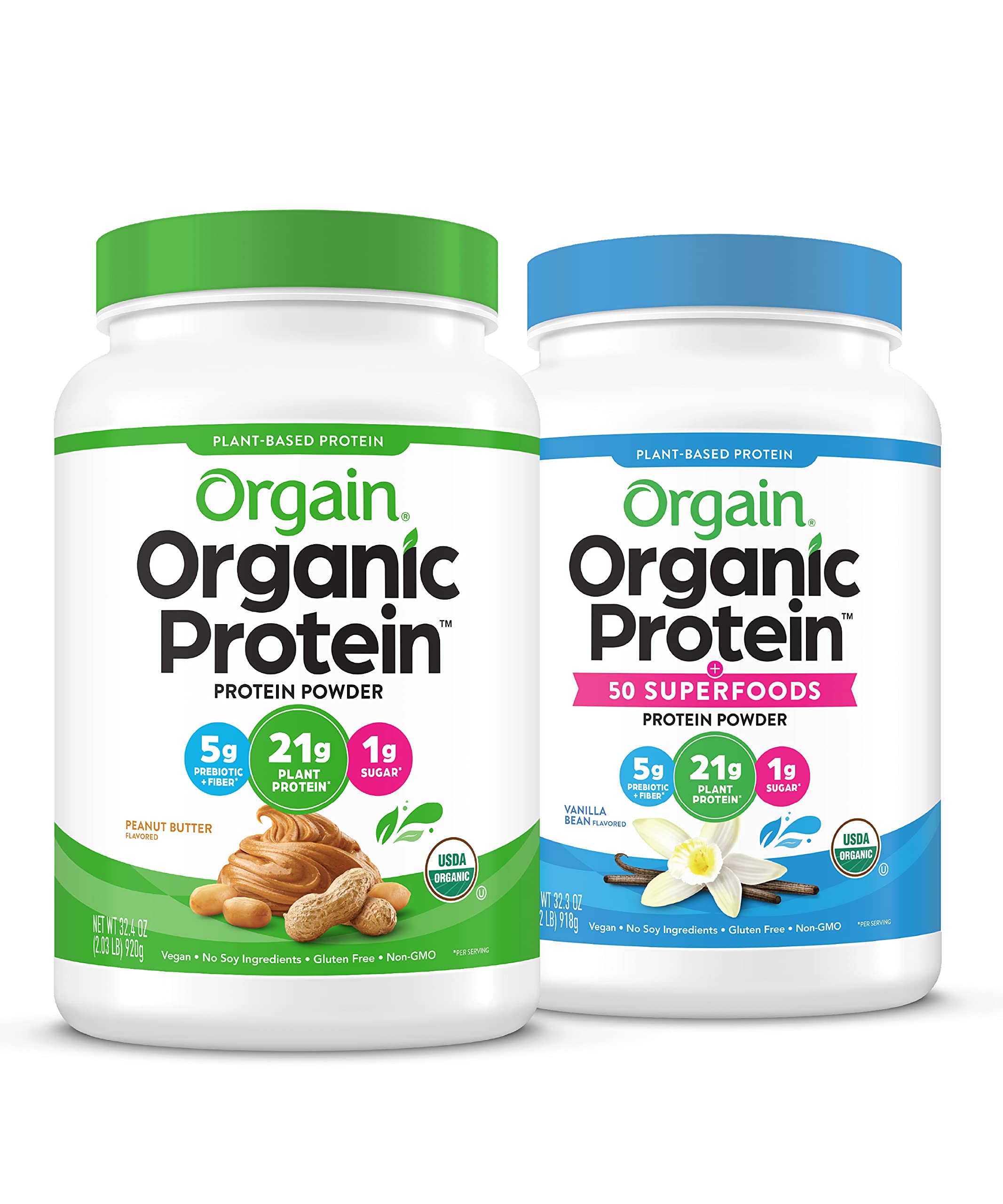Orgain Organic Plant Based Protein Powder, Peanut Butter - Vegan, Low Net Carbs, Non Dairy, Gluten Free, Lactose Free, No Sugar Added, Soy Free, Kosher, Non-GMO, 2.03 Pound (Packaging May Vary) Orgain Organic Peanut Butter Protein Powder is a naturally smooth and delicious nourishment drink with 21 grams of organic protein and 6 grams organic fiber per serving. USDA Organic, Gluten Free, Kosher, Vegan, Non GMO, Soy Free. No artificial flavors, colors or preservatives. Orgain Organic Plant Based Protein Superfoods Powder, Vanilla Bean - Vegan, Non Dairy, Lactose Free, No Sugar Added, Gluten Free, Soy Free, Non-GMO, 2.02 lb Orgain Organic Protein Superfoods is a nutritional powerhouse with all in one convenience. Organic Protein Superfoods features 21 grams of organic, plant based protein and 50 organic superfoods, alon grams with a healthy servin grams of organic fiber. With Organic Protein Superfoods you can save the time, expense, and mess of numerous powders and supplements and get your nutrition in one smooth and delicious serving. This powder makes a great meal replacement, smoothie booster, or post workout replenishment. USDA certified organic, gluten free, soy free, and Non GMO.Ideal plant based nutrition for healthy lifestyle. Can be used as meal replacement, smoothie boosters or for muscle health. Protein powder provides 150 calories, 2g fiber per serving. Superfoods powder provides good source of vitamins B6, C and minerals like iron. 21g of organic plant protein from pea, brown rice and chia seeds per serving in protein powder. 50 organic superfoods including veggies, herbs and greens per scoop in superfoods powder. Vegan, USDA organic, gluten free, dairy free, lactose free, non GMO, no added sugar. Includes 1 (2.03 Lb) Orgain Organic Plant Based Peanut Butter Protein Powder and 1 (2.02 Lb) Orgain Organic Protein and Superfoods Vanilla Bean Powder.