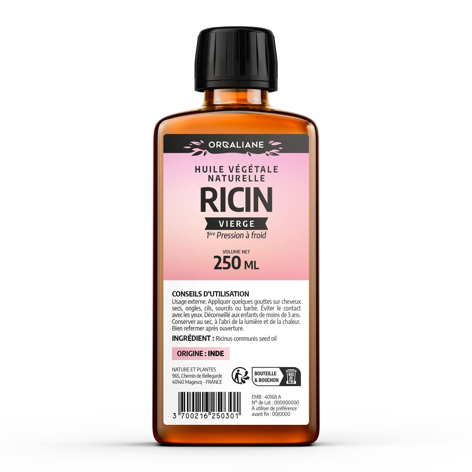 Castor oil is a highly prized vegetable oil extracted from the seeds of the castor bean plant (Ricinus communis). In cosmetics, castor oil has been used since at least the 19th century to beautify and protect the hair and beards of both men and women, or to treat them: when applied topically, it combats dandruff, alopecia (hair loss), canitia (gray hair), and itching, among other things. For this purpose, it is sometimes combined with other plants such as rosemary. Many old advertisements highlight all the benefits, presented as medicinal properties. It is also known to strengthen and lengthen eyelashes, eyebrows, and nails. This thick, viscous oil is also used to deeply moisturize dry skin and to soften and repair damaged skin. In addition to its nourishing and revitalizing properties (always for external use), castor oil is said to greatly promote hair growth and add volume. INGREDIENTS 100 Castor Oil, First Cold Pressed DIRECTIONS bp1: Apply to dry hair 2 to 3 times a week, leave on for half an hour, then wash thoroughly. bp2: 1 to 2 drops each evening on a cotton pad. bp3: 1 to 2 drops each evening on a mascara brush. bp4: Apply a few drops to your beard each evening. SAFETY WARNING Avoid contact with eyes. Not recommended for children under 3 years old. Store in a dry place, away from light and heat. Close tightly after opening. See more? Beard: Apply a few drops to the beard each evening. ? Eyelashes and Eyebrows: 1 to 2 drops each evening on a mascara brush. ? Nails: 1 to 2 drops each evening on a cotton pad. ? Hair: Apply to dry hair, 2 to 3 times a week, leave on for half an hour, then wash thoroughly.Huile de Ricin 250 ml - Orgaliane - Pure et Naturelle - Barbe, Cheveux, Cils, Ongles, Peau. 250 ml (Lot de 1)DESCRIPTION DU PRODUIT DESCRIPTION DU PRODUIT L'huile de ricin est une huile végétale très précieuse, extraite des graines de ricin (Ricinus communis). En cosmétique, l'huile de ricin est utilisée depuis au moins le 19ème siècle pour embellir et protéger les cheveux et la barbe des femmes et des hommes ou pour les traiter : en application, elle combat les pellicules, l'alopécie (perte de cheveux), la canitia (cheveux blancs) ou les démangeaisons, etc. Pour ce faire, il est parfois associé à d'autres plantes comme le romarin. Beaucoup de vieilles publicités montrent tous les avantages qui sont présentés comme faisant partie de la médecine. Il est également connu pour renforcer et allonger les cils et les sourcils, ainsi que les ongles. Cette huile dense et visqueuse est également utilisée pour hydrater en profondeur les peaux sèches et pour adoucir et réparer les peaux endommagées. En plus de sa fonction nourrissante et revitalisante (toujours en usage externe), l'huile de ricin favoriserait grandement la croissance des cheveux et leur donnerait du volume. INGRÉDIENTS 100 huile de Ricin, 1 ère pression à froid MODE D'EMPLOI bp1: Appliquer sur cheveux secs, 2 à 3 fois par semaine, laisser reposer une demi-heure, puis laver soigneusement. bp2: 1 à 2 gouttes chaque soir sur un coton. bp3: 1 à 2 gouttes chaque soir sur une brosse à mascara. bp4: Appliquer quelques gouttes sur la barbe chaque soir. AVERTISSEMENT DE SÉCURITÉ Éviter le contact avec les yeux. Déconseillé aux enfants de moins de 3 ans. Conserver au sec, à l'abri de la lumière et de la chaleur. Bien refermer après ouverture. Voir plus? Barbe : Appliquer quelques gouttes sur la barbe chaque soir. ? Cils et Sourcils : 1 à 2 gouttes chaque soir sur un brosse à mascara. ? Ongles : 1 à 2 gouttes chaque soir sur un coton. ? Cheveux : Appliquer sur cheveux secs, 2 à 3 fois par semaine, laisser reposer une demi-heure, puis laver soigneusement.