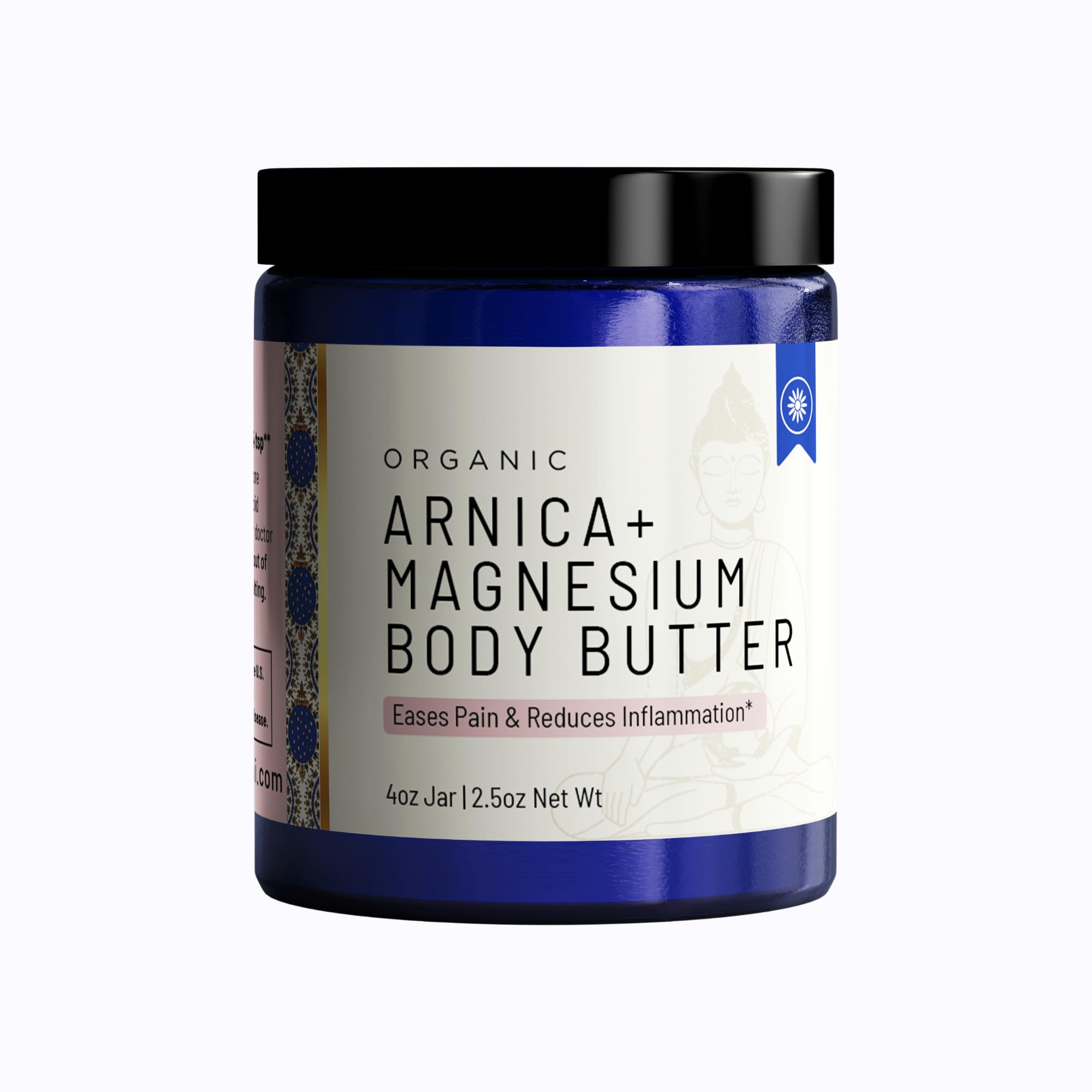 Blue jar of organic arnica magnesium body butter made by Sonam Sondhi