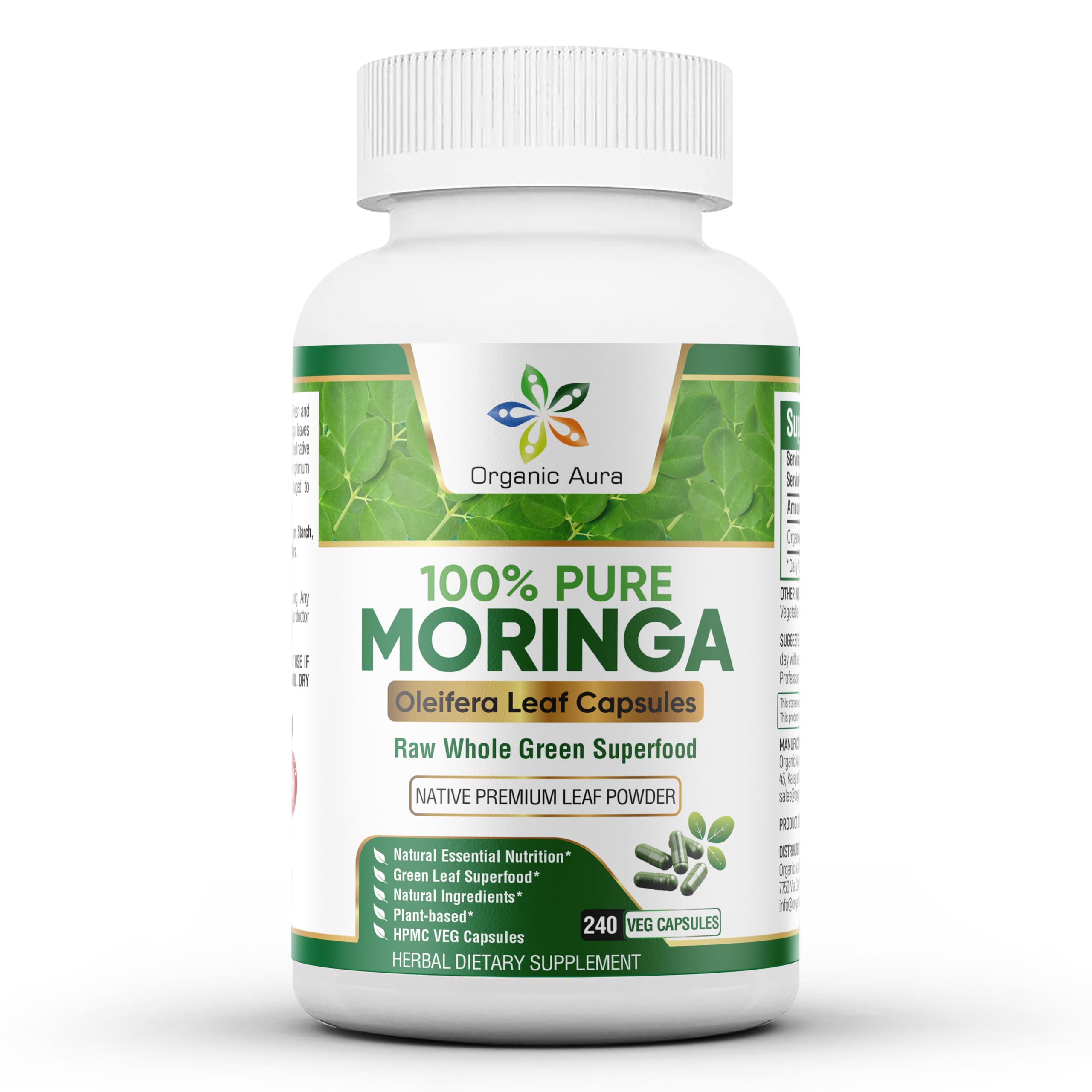 Organic Aura Moringa Capsules - 240 Ct Wholesale Pack. Authentic Raw Moringa Leaf Supplement for Energy Metabolism Lactation Immunity & Joint Health. Whole Leaves Green Super Food Nutrition.